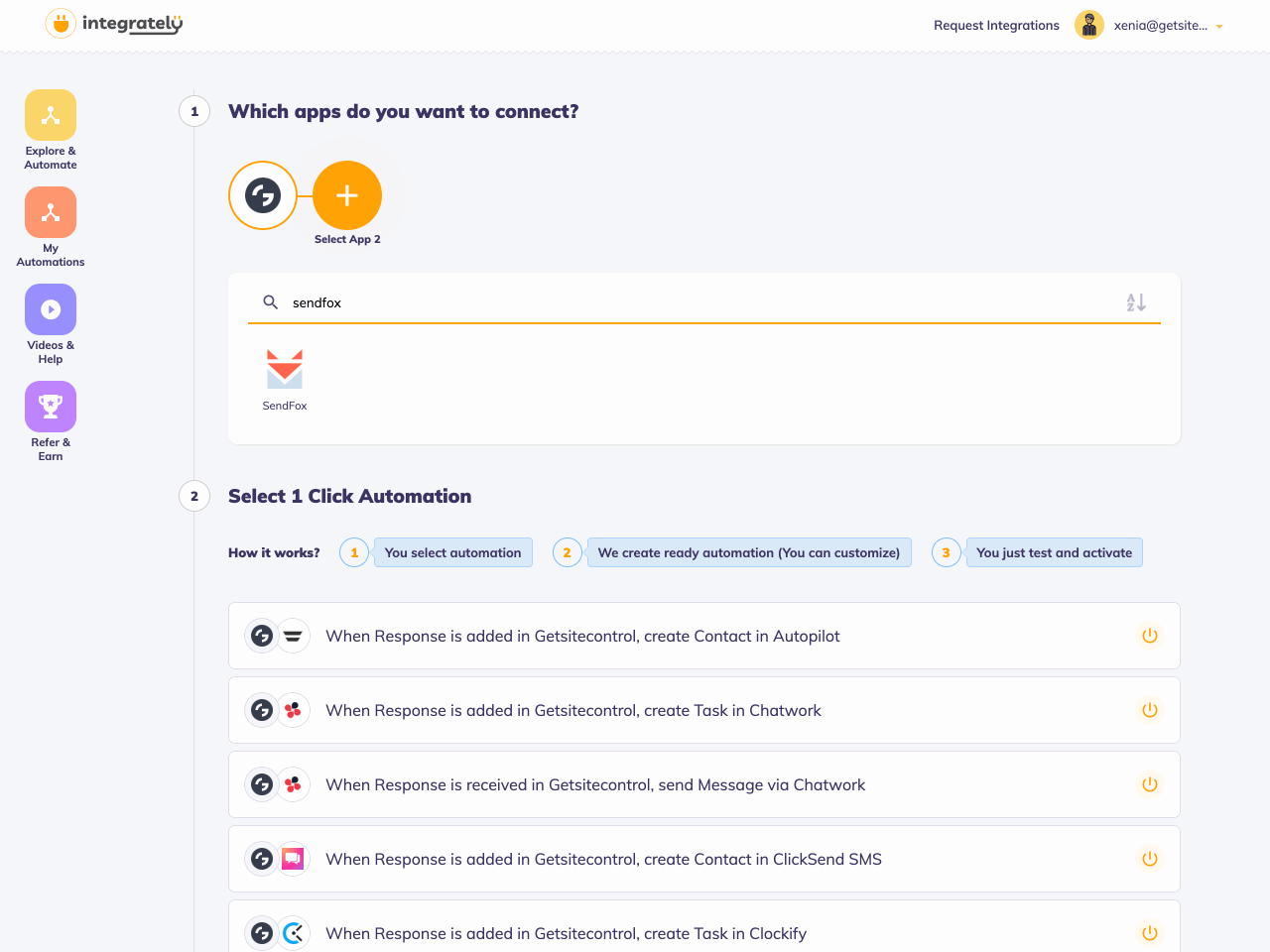 To set up a new integration, sign in to your Integrately account and use the search bar to find Getsitecontrol and the app you want to connect.