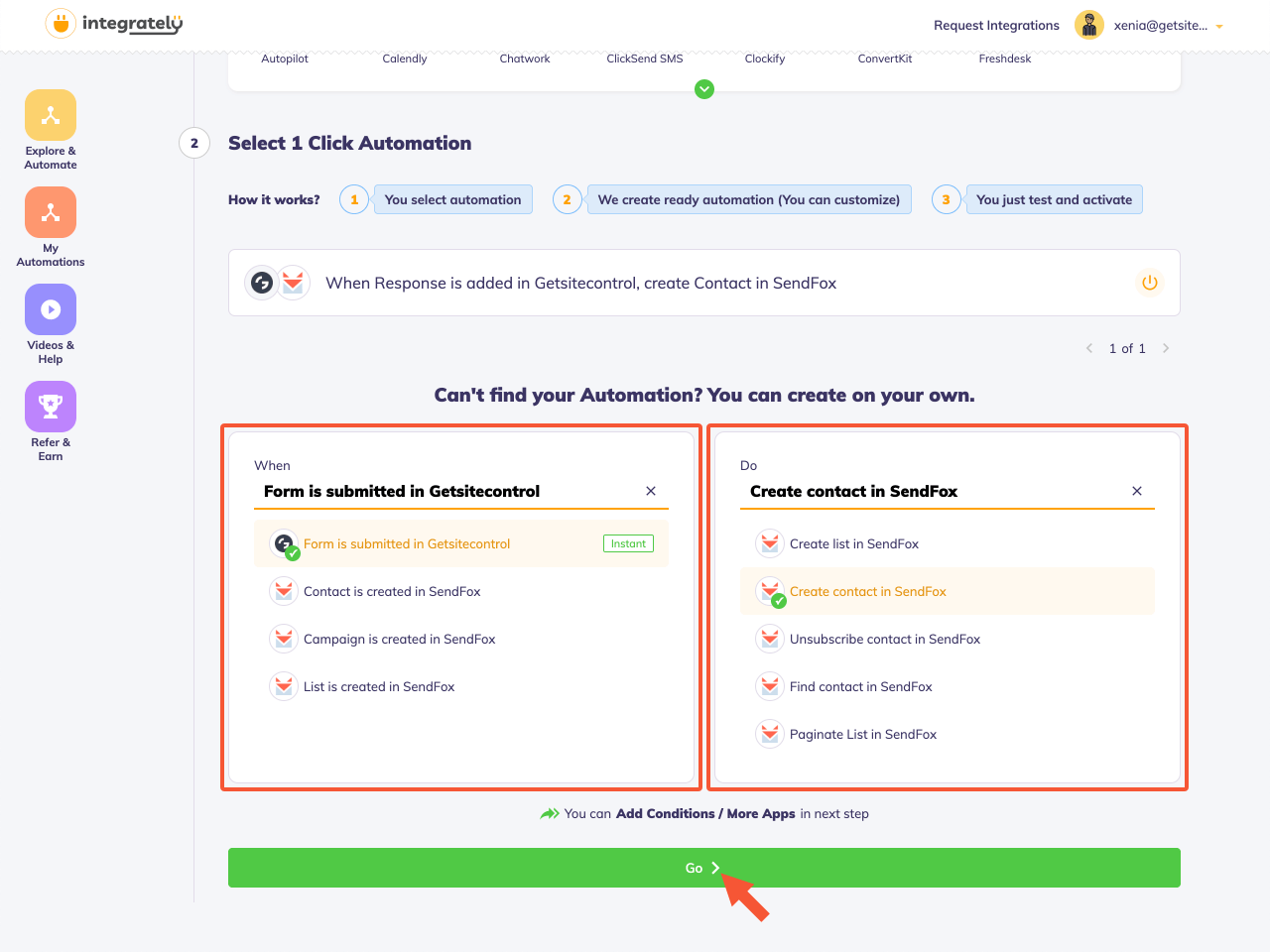 Next, select automation. There is only one available option — Form is submitted in Getsitecontrol that triggers an event in the other connected app. Choose the action you want to be performed when someone submits your Getsitecontrol form. Depending on the app it can be adding a new contact, creating a task, sending a message, etc. Then click Go to continue.