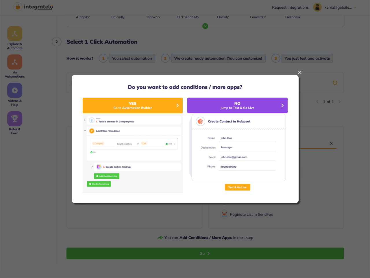 Now you can connect your app, follow the instructions of Integrately and click Test & Go Live to complete the setup.