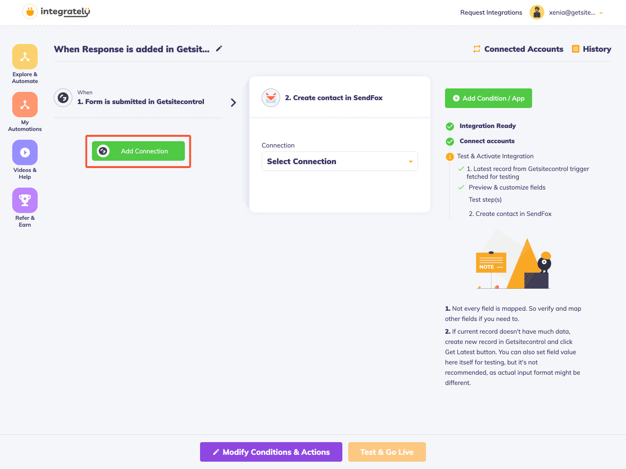 Connect your Getsitecontrol account by clicking the Add Connection button.