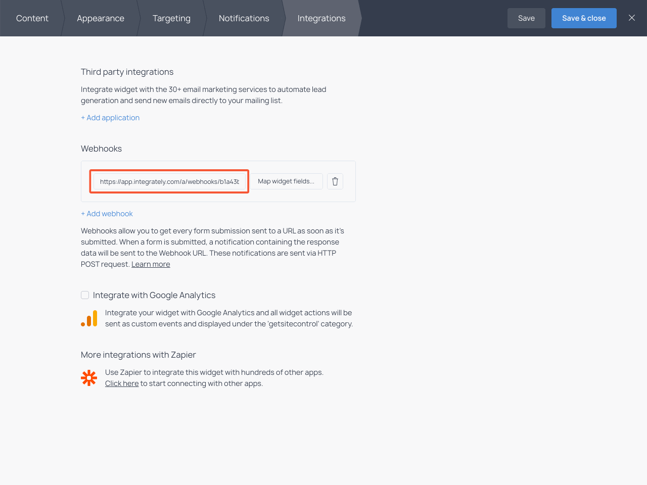Go to your Getsitecontrol account, click Edit to open the settings of the necessary widget. Switch to the Integrations tab, click +Add webhook and paste the copied URL.