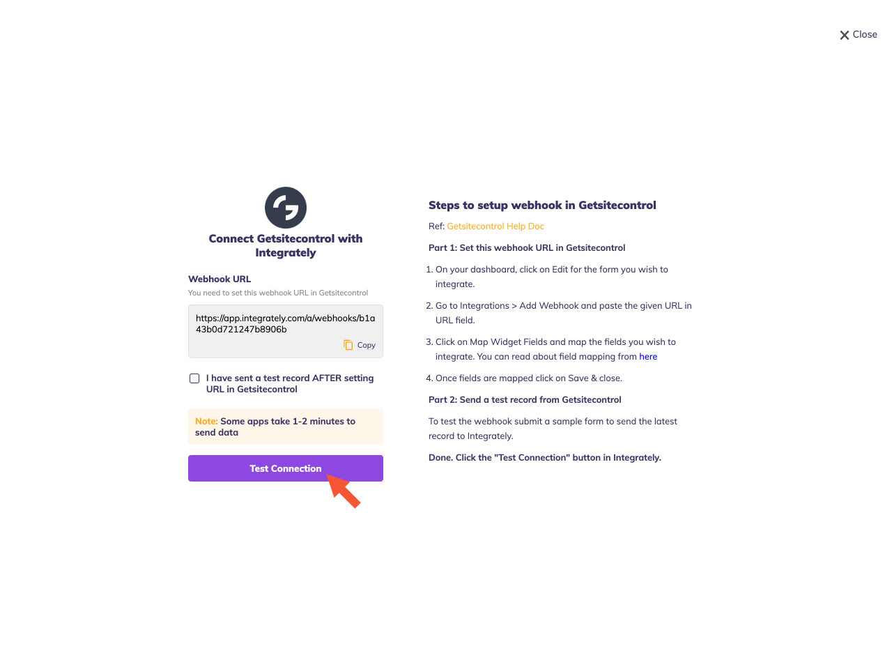 Fill out the edited widget on your website to send a test record and go back to the Integrately page. Click Test integration.