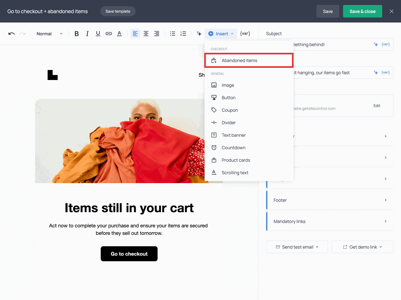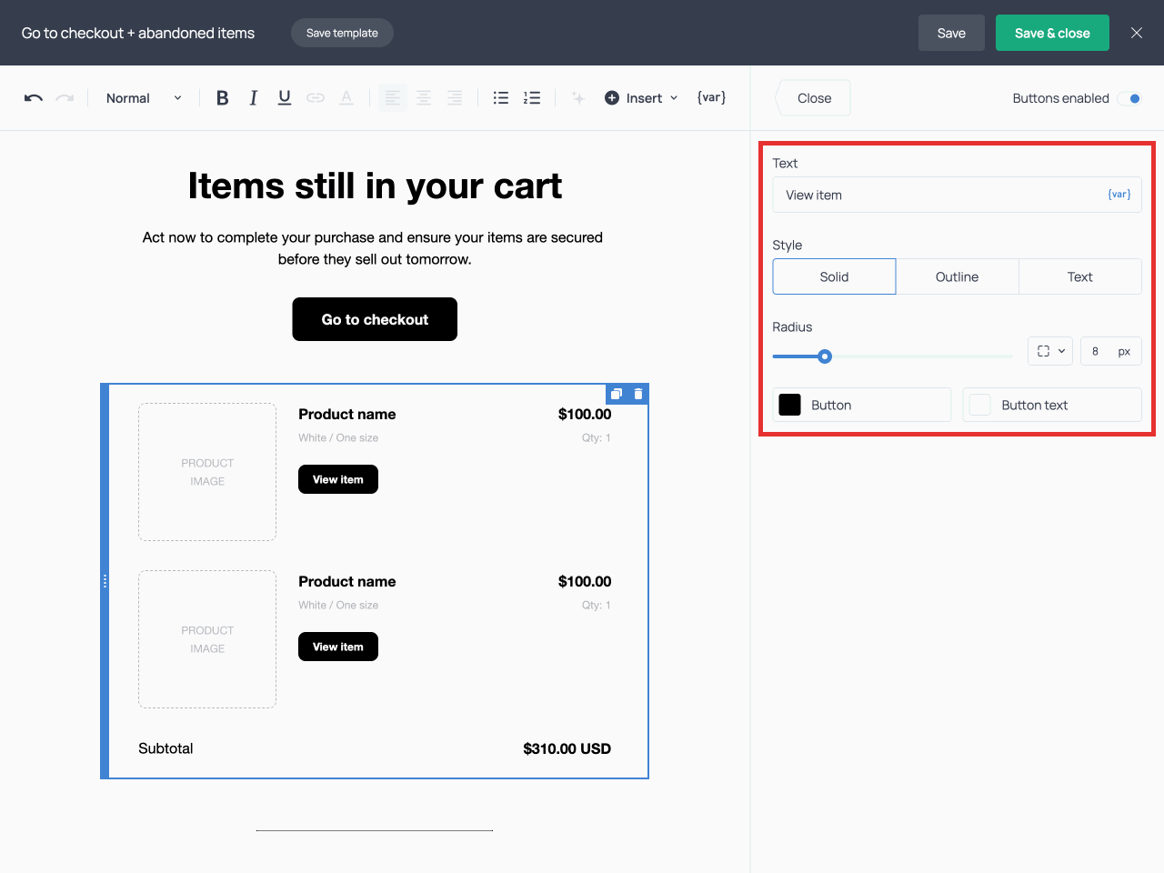 This element may be called Abandoned items, Purchased items, or Fulfilled items, depending on the type of automation you’re building. Regardless, these elements work in the same way: they dynamically display the products (abandoned, purchased, or shipped), and feature buttons that allow customers to view the products in your store.