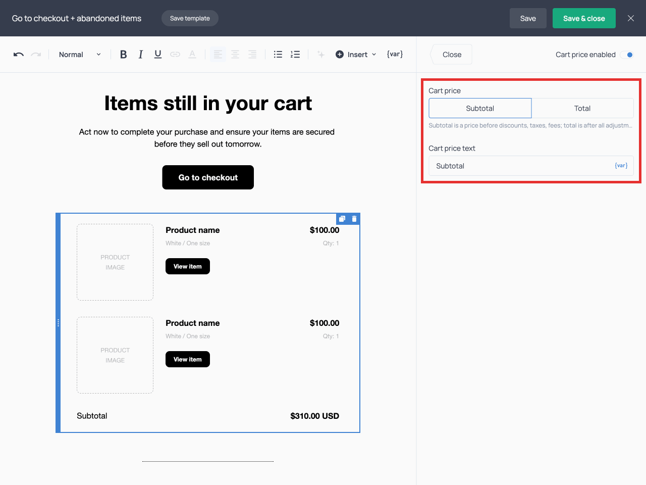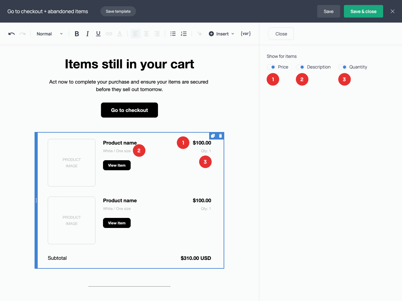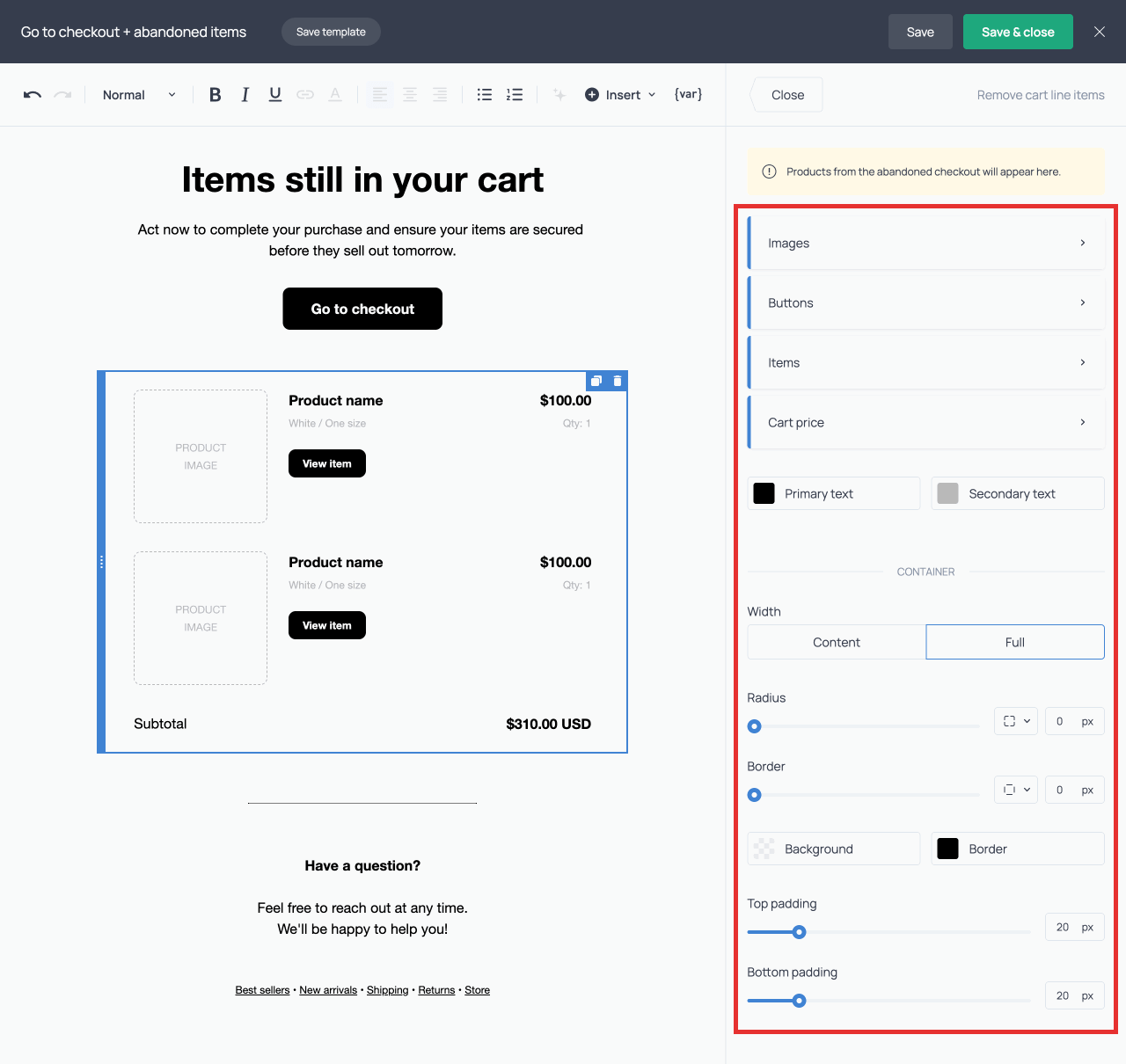 The product image, name, price, and quantity will be automatically fetched from your store, but you can adjust the design, placement, and colors of these elements.