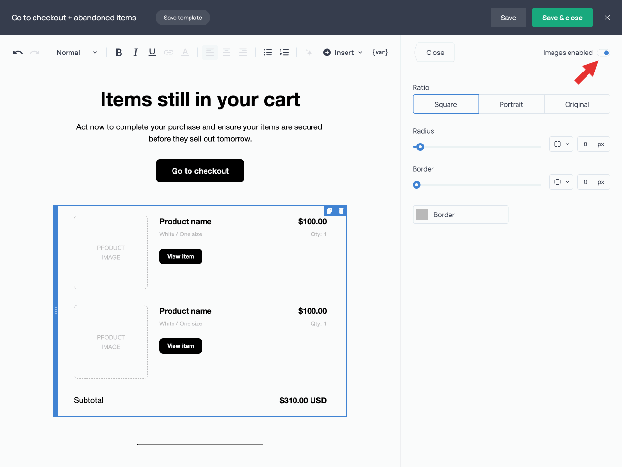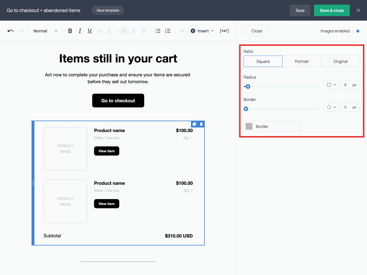 Open the Images block and proceed to style the product images. You can adjust the following parameters: