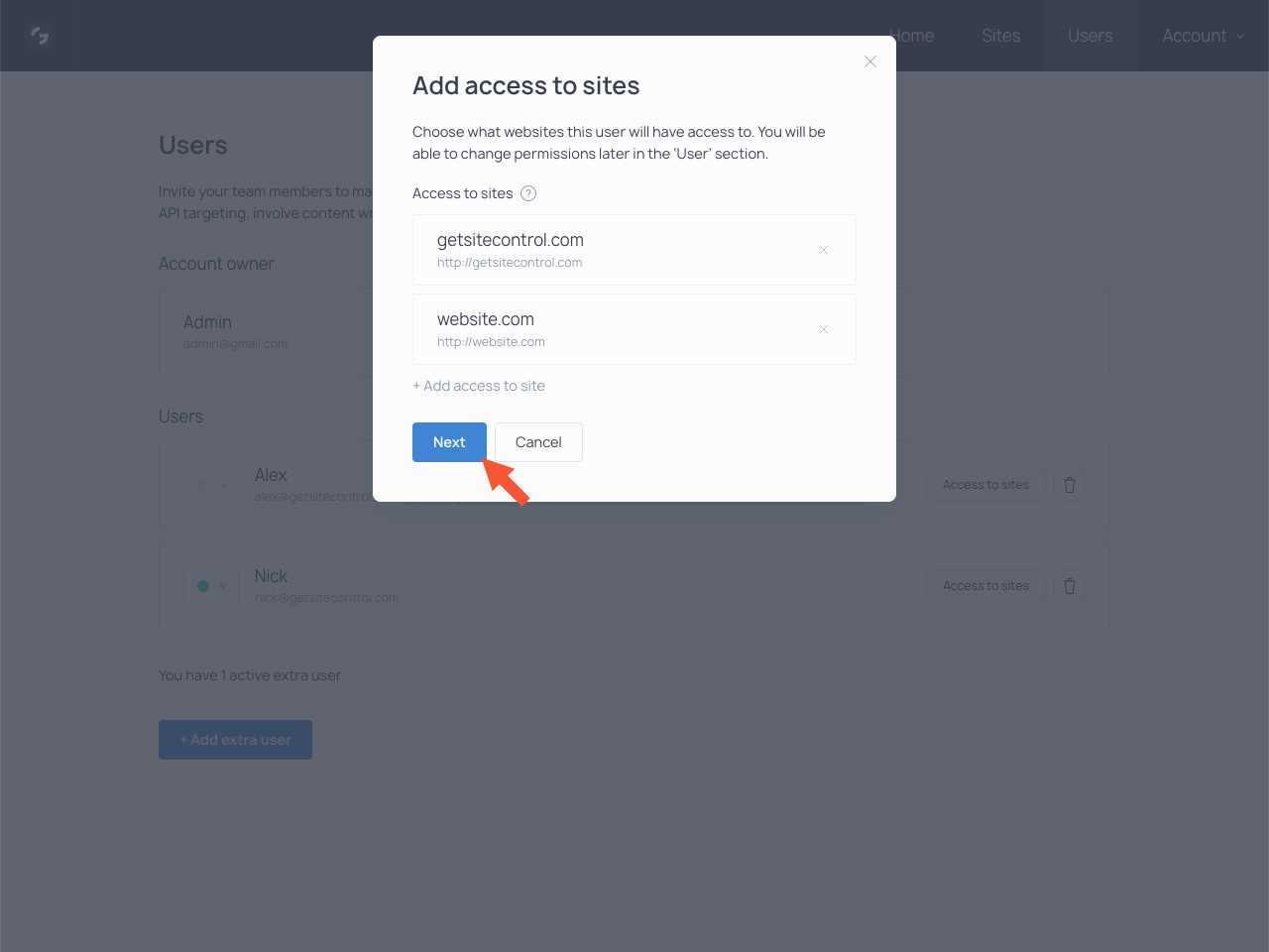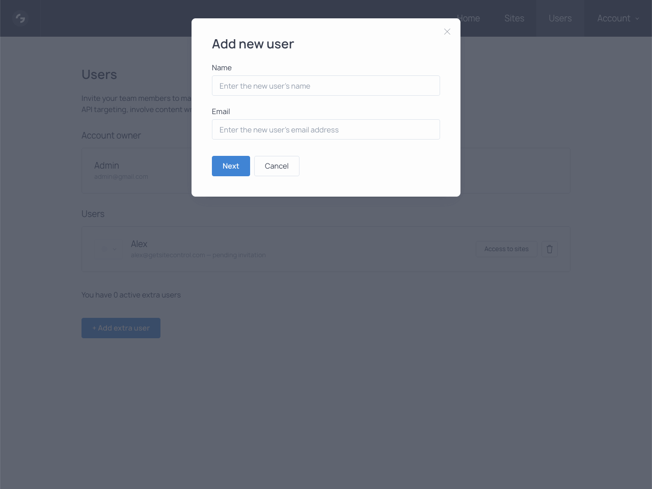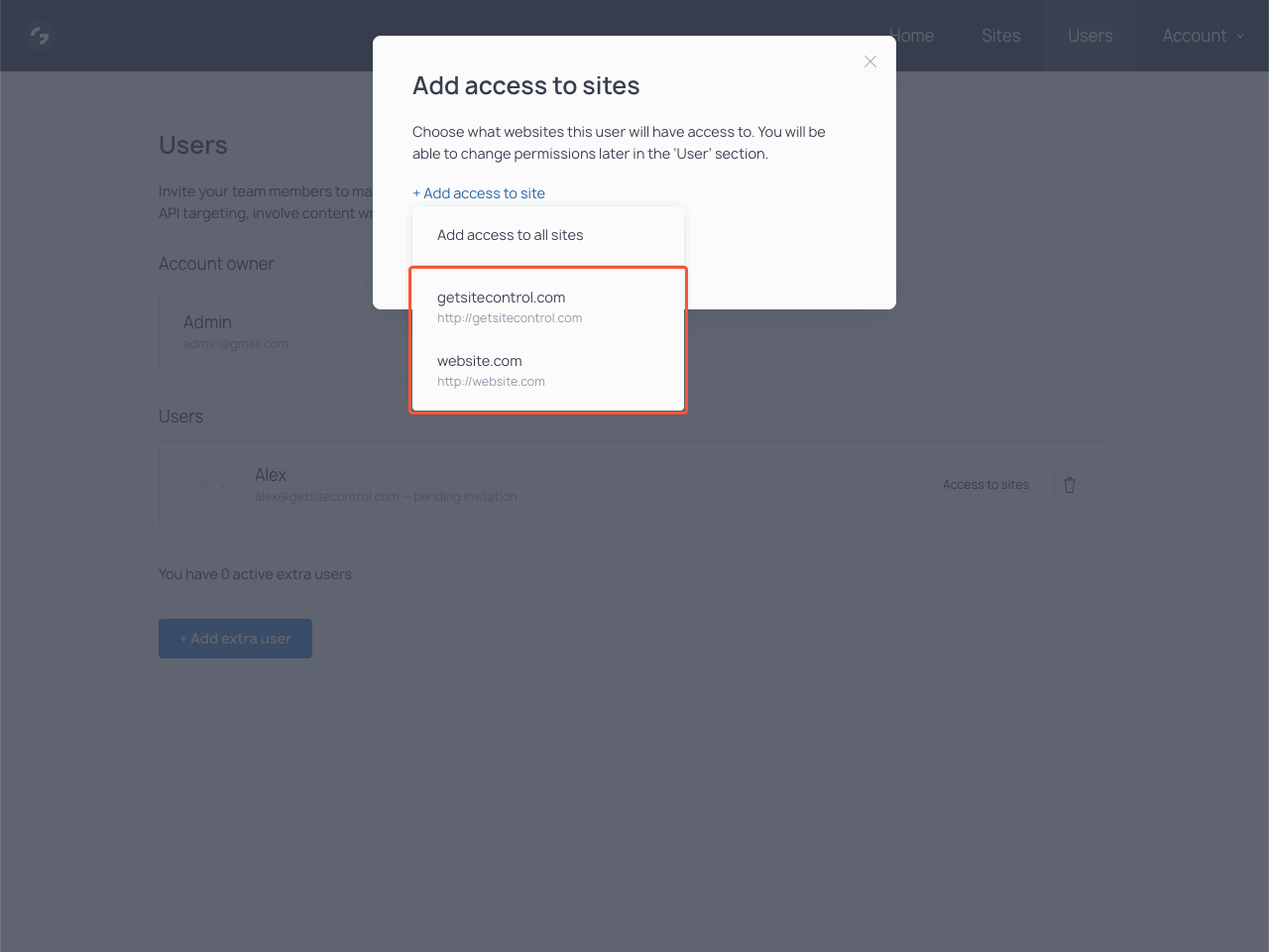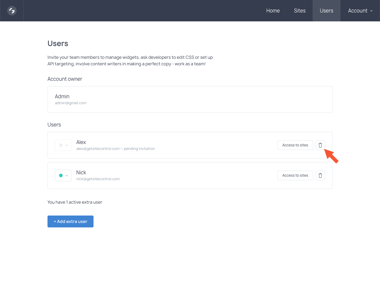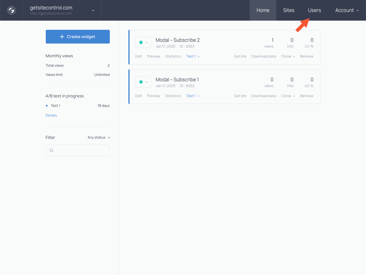 Sign in to your Getsitecontrol account. In the top bar, find the Users section and open it.