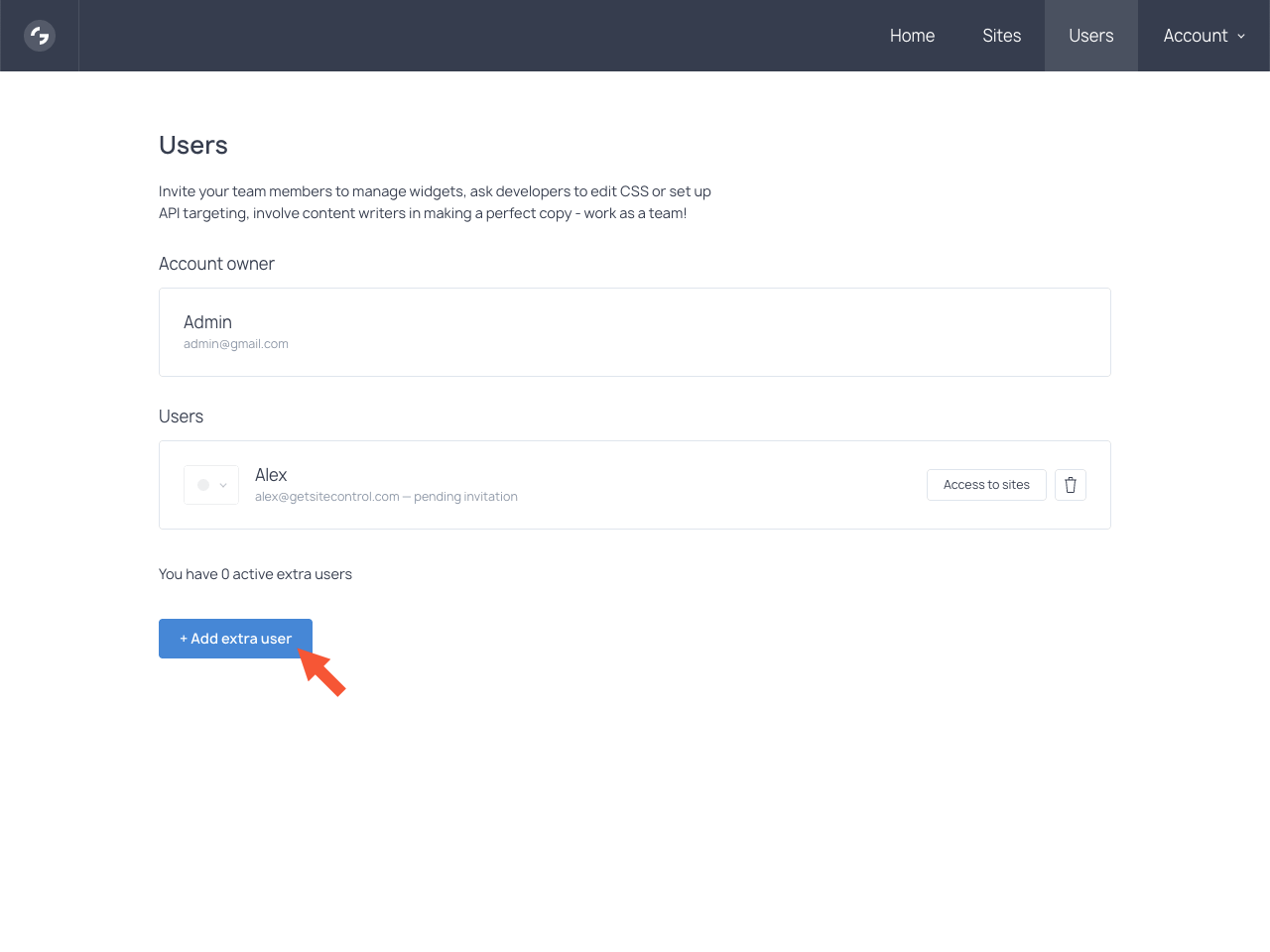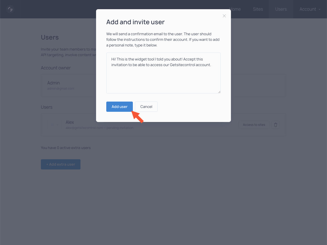 That’s it! The new user has been added. Once they accept your invitation, they will be able to log in to your Getsitecontrol account and manage widgets in it.