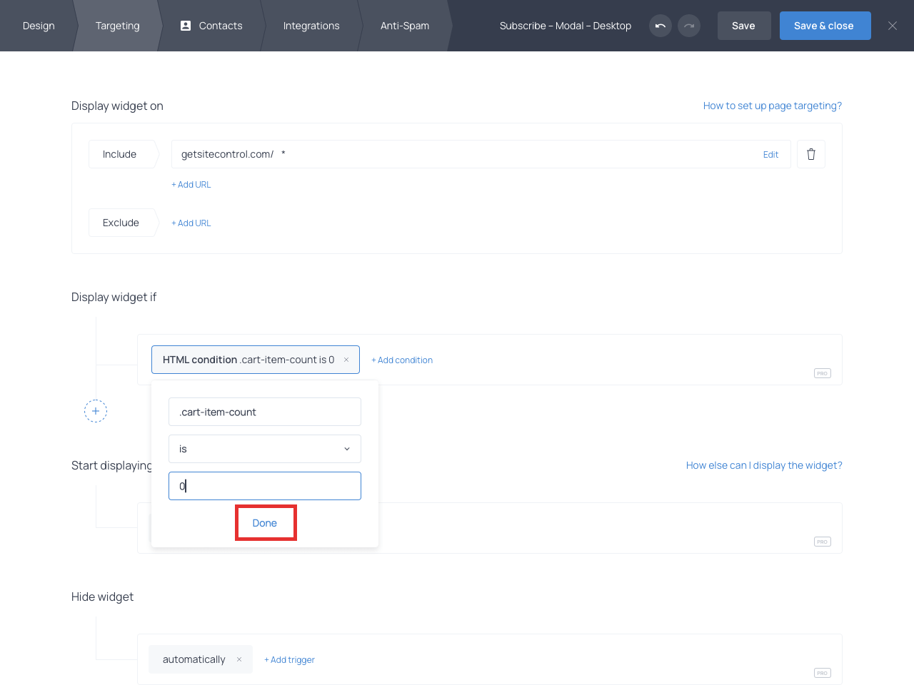 When setting up targeting for your widget, find the ‘Display widget if’ section. Switch to the ‘Developer’ tab and click HTML condition.