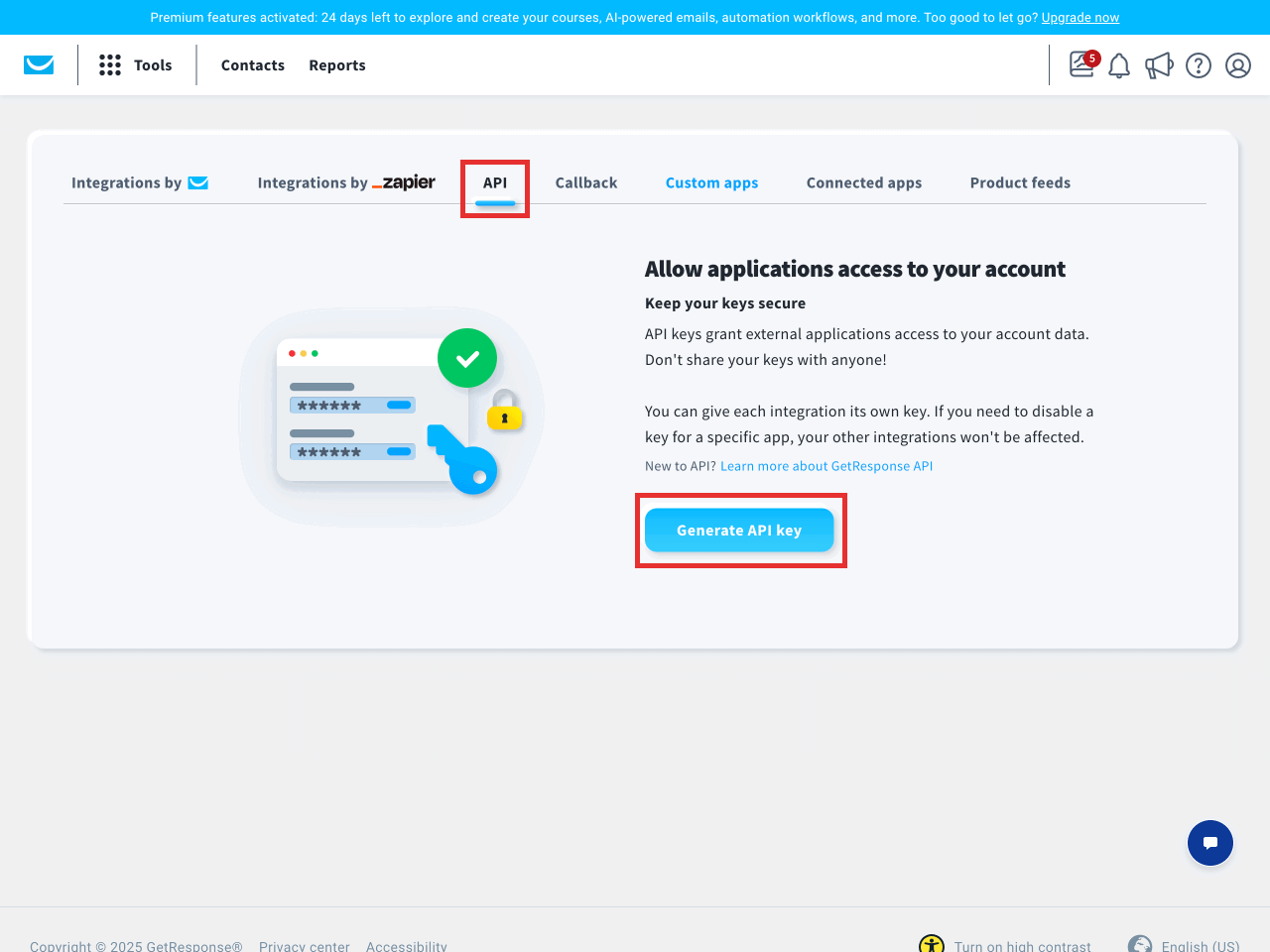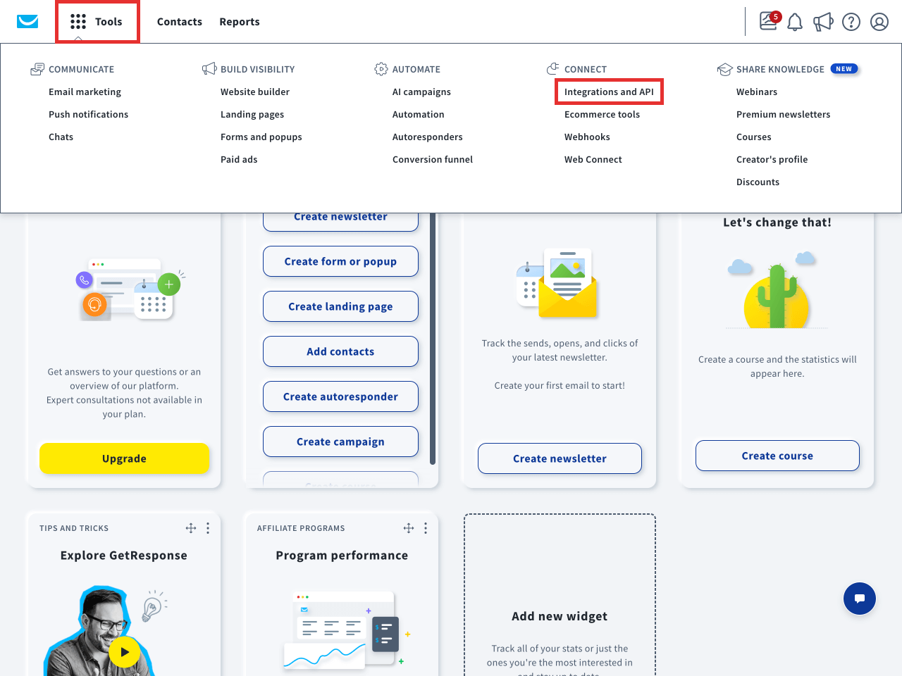 To find your API key, log in to GetResponse, click ‘Tools’ in the top bar, and select ‘Integrations and API’ from the menu.
