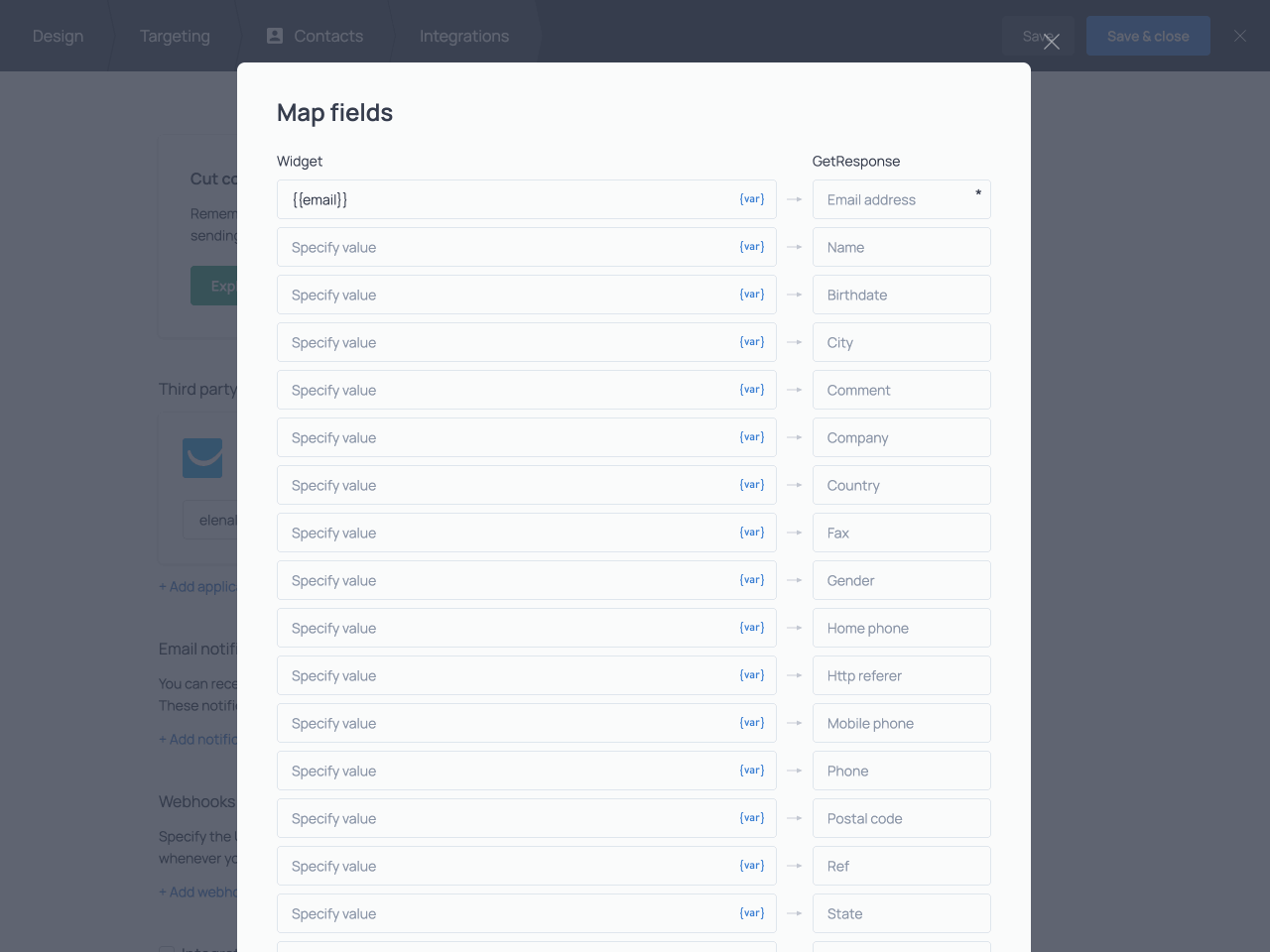 Next, hit the {var} icon next to a source field. In the variable menu, select the form field to match with the GetResponse field in the column on the right.