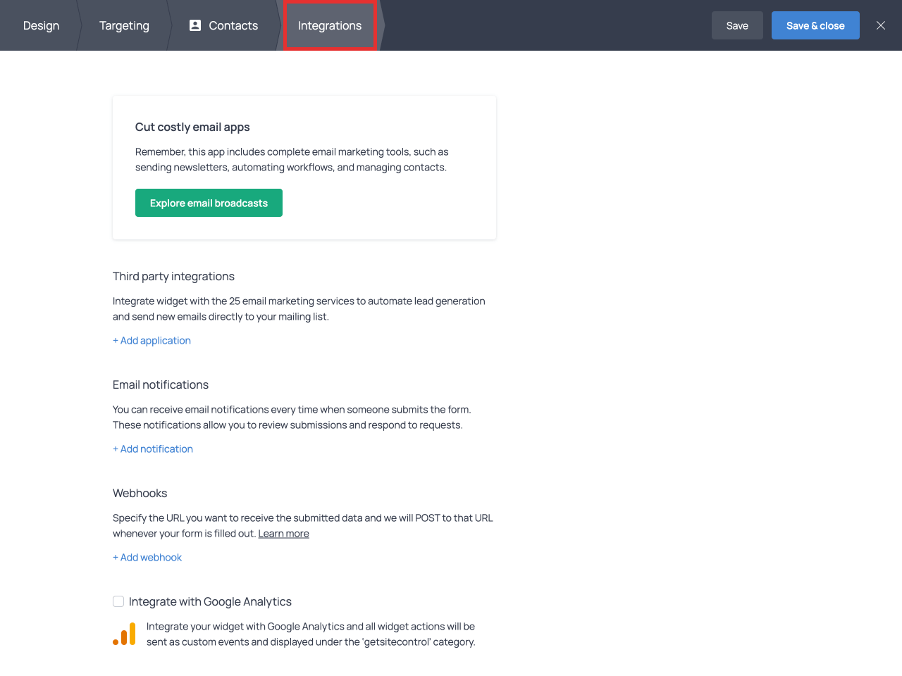 Open the form you want to connect to Keap. From the top bar of the widget editor, switch to the Integrations tab.