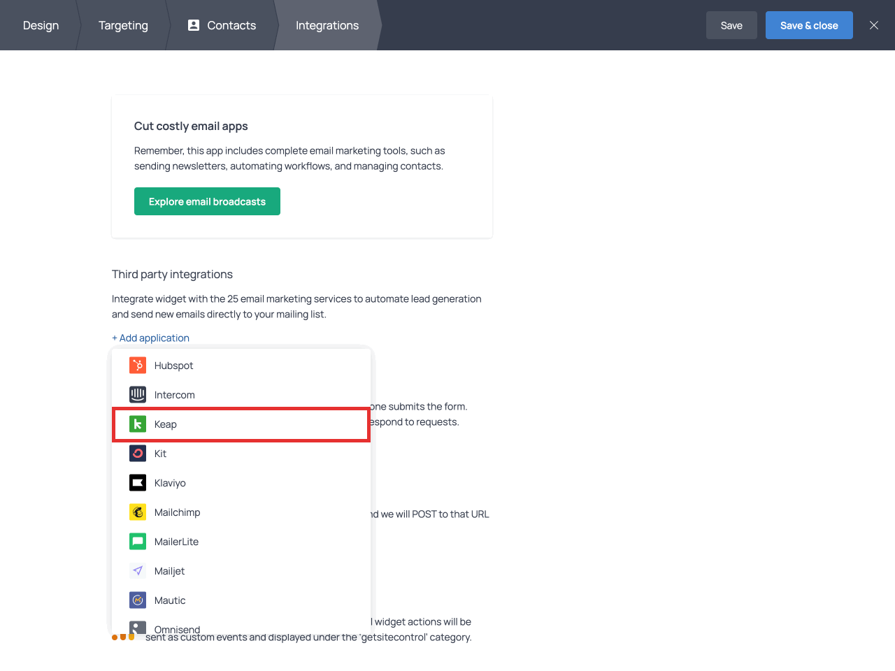 In the ‘Third party integrations’ section, click the +Add application link and choose Keap from the drop-down list.