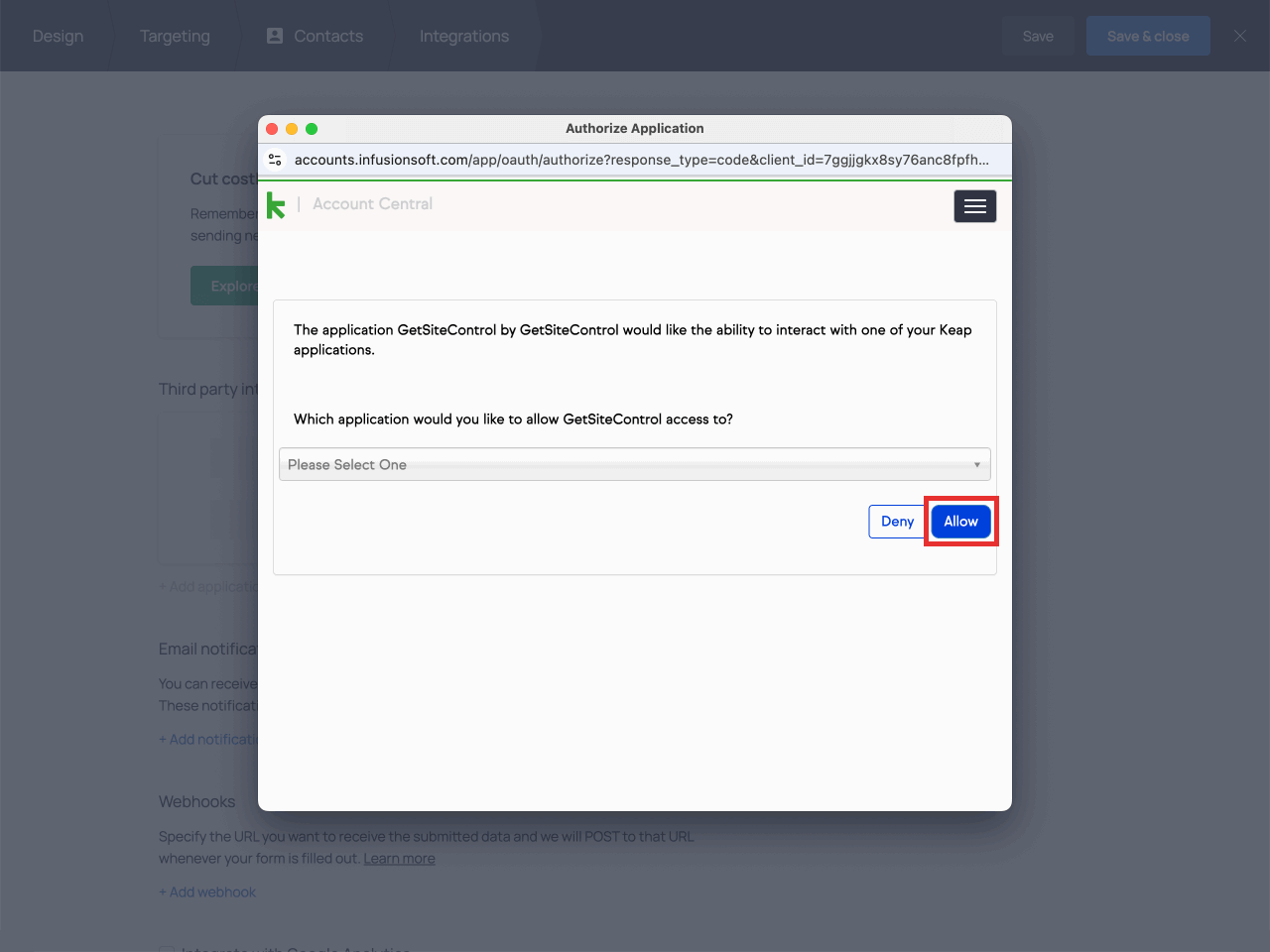In the following screen, allow Getsitecontrol to interact with your Keap applications.