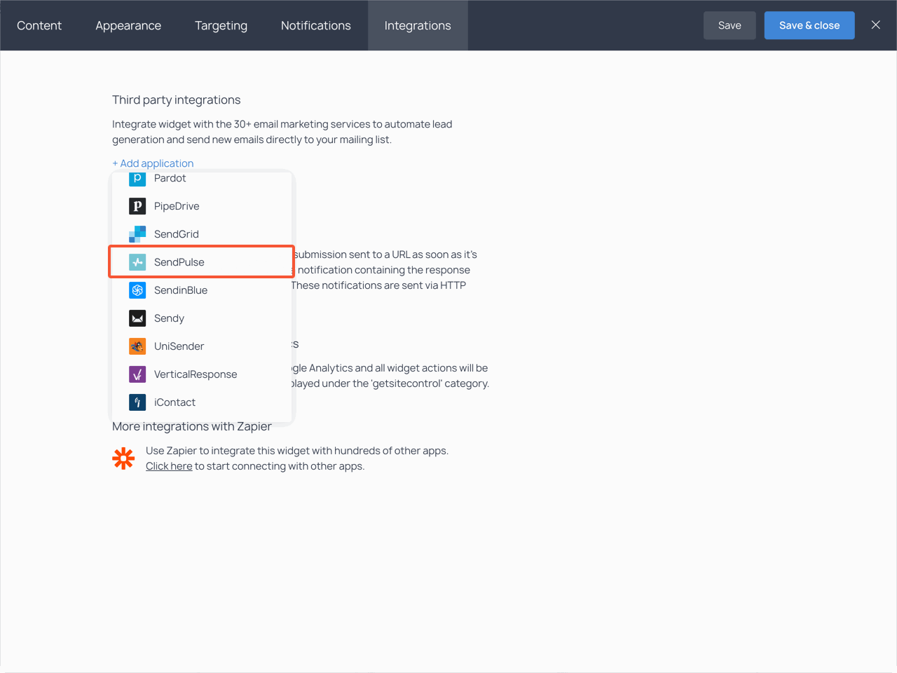 In the Third party integrations section, click the +Add application link and choose SendPulse from the drop-down list.