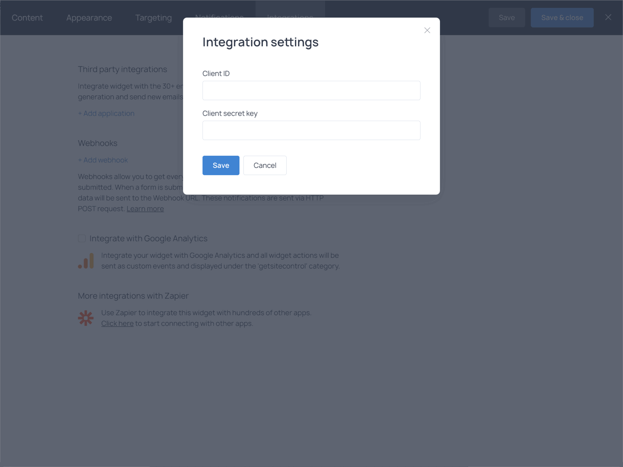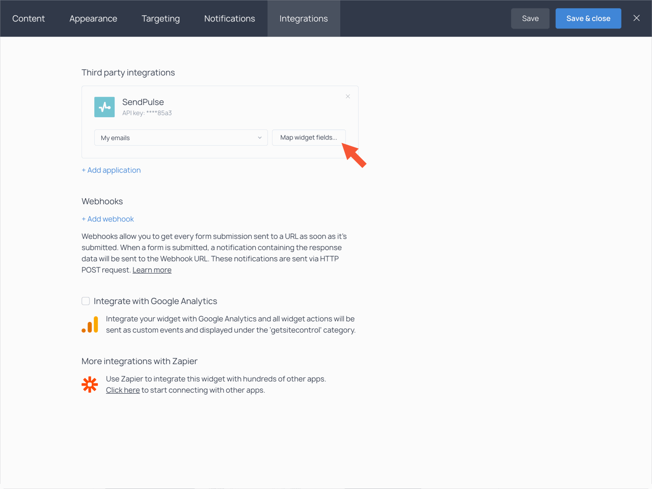 You can connect your Getsitecontrol account to SendPulse when editing your widget. Choose the Integrations tab in the top bar.