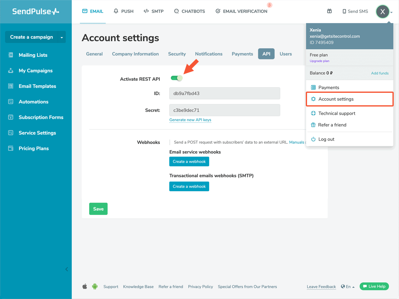 You can create the Client ID and secret key by going to Account settings in your SendPulse account. Choose API, activate REST API and click Save.