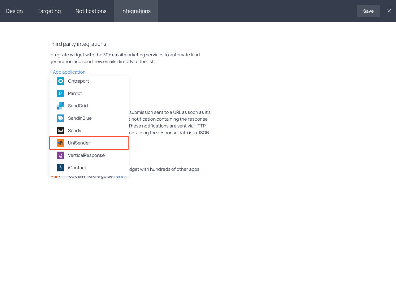In the Third party integrations section, click the +Add application link and choose Unisender from the drop-down list.