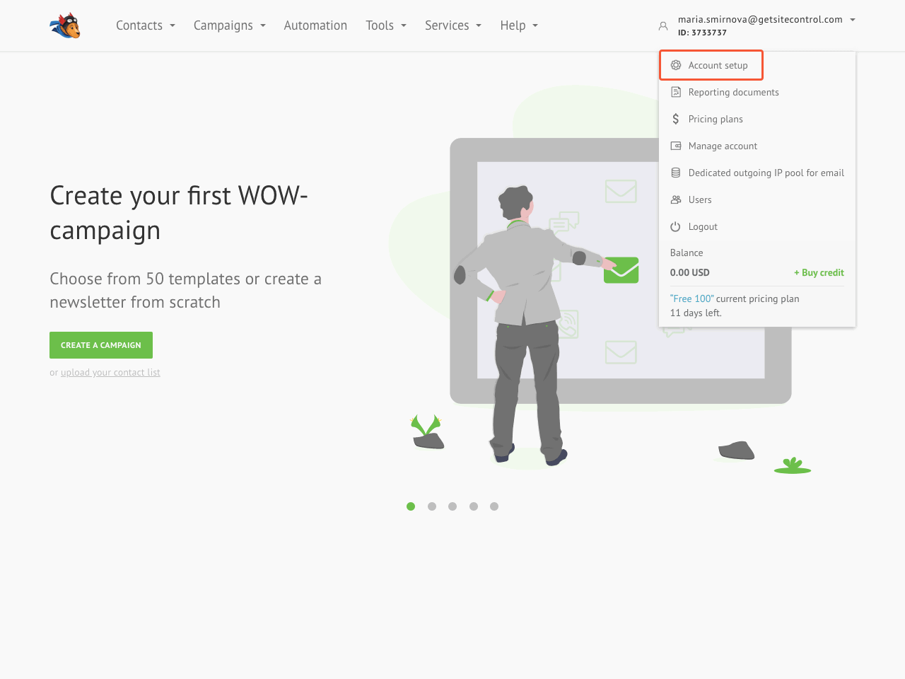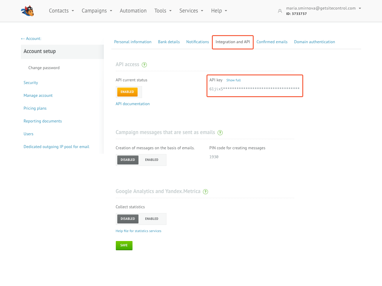 To find your API key, go to your Unisender account, click on your user name and switch to Account setup.