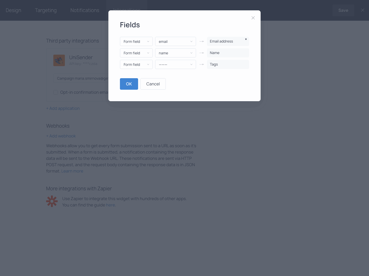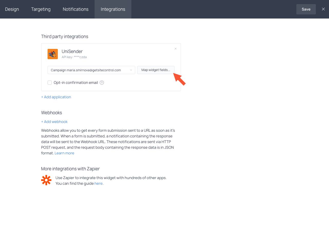 Make sure the fields of your widget are matched to those in the Unisender list. Click the Map widget fields button to check that the fields are properly matched. You can read more about field mapping here.
