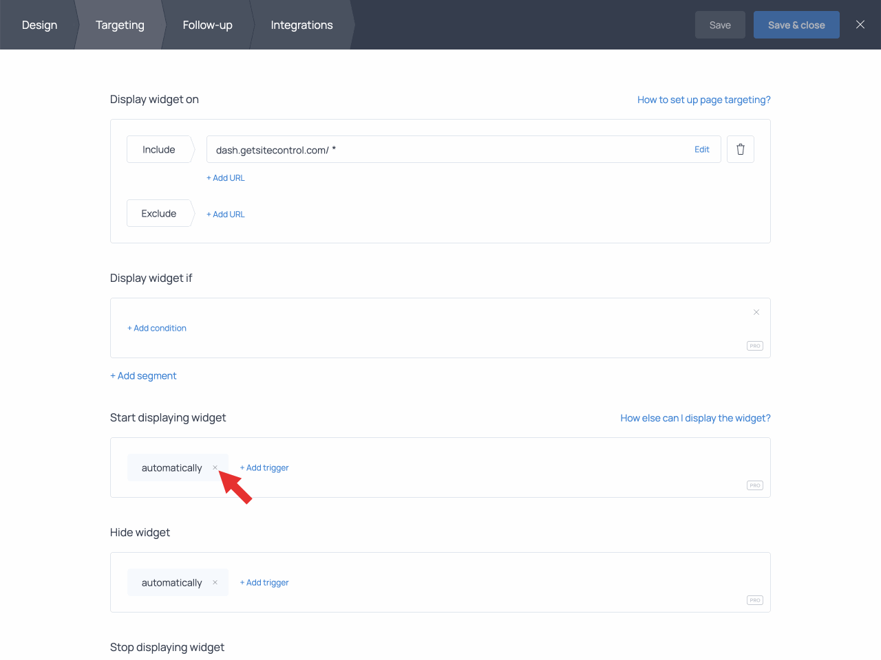 Then, switch to the Targeting tab and find the ‘Start displaying widget’ section.