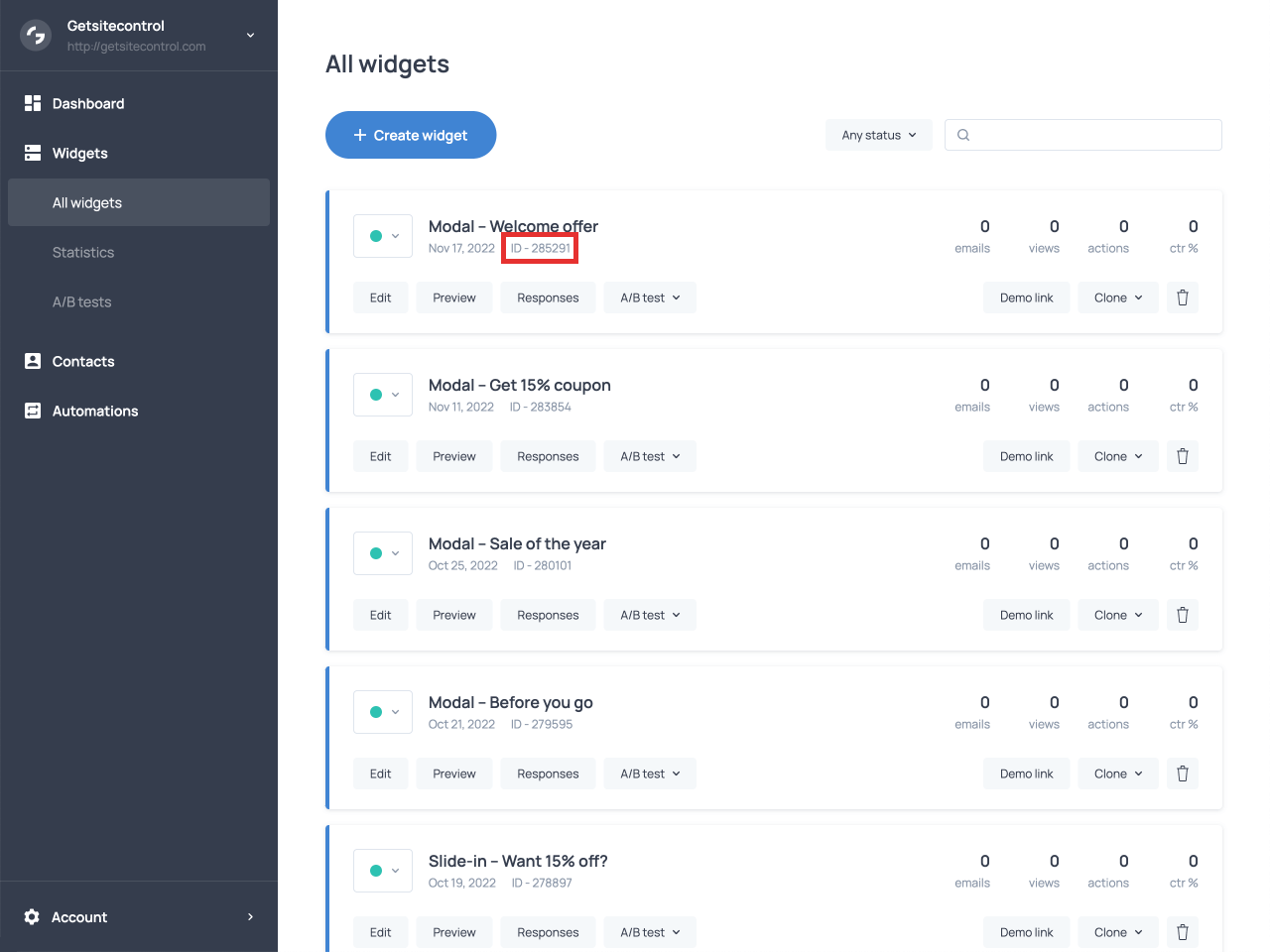 To find the ID, go to the list of your widgets in the dashboard. The unique ID of each widget is indicated right under the widget’s name.