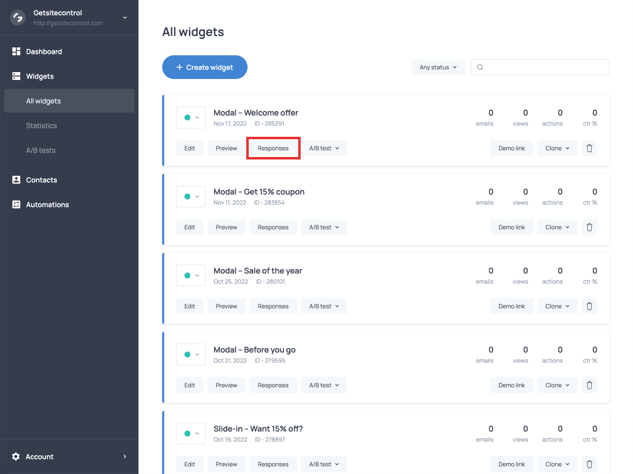Open your Getsitecontrol dashboard, find the necessary widget on the list, and click Edit.