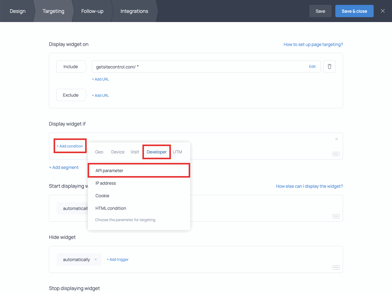 Next, open the necessary widget and switch to the Targeting tab. Find the ‘Display widget if’ section and click the +Add condition link. Switch to the Developer tab and choose API parameter from the list: