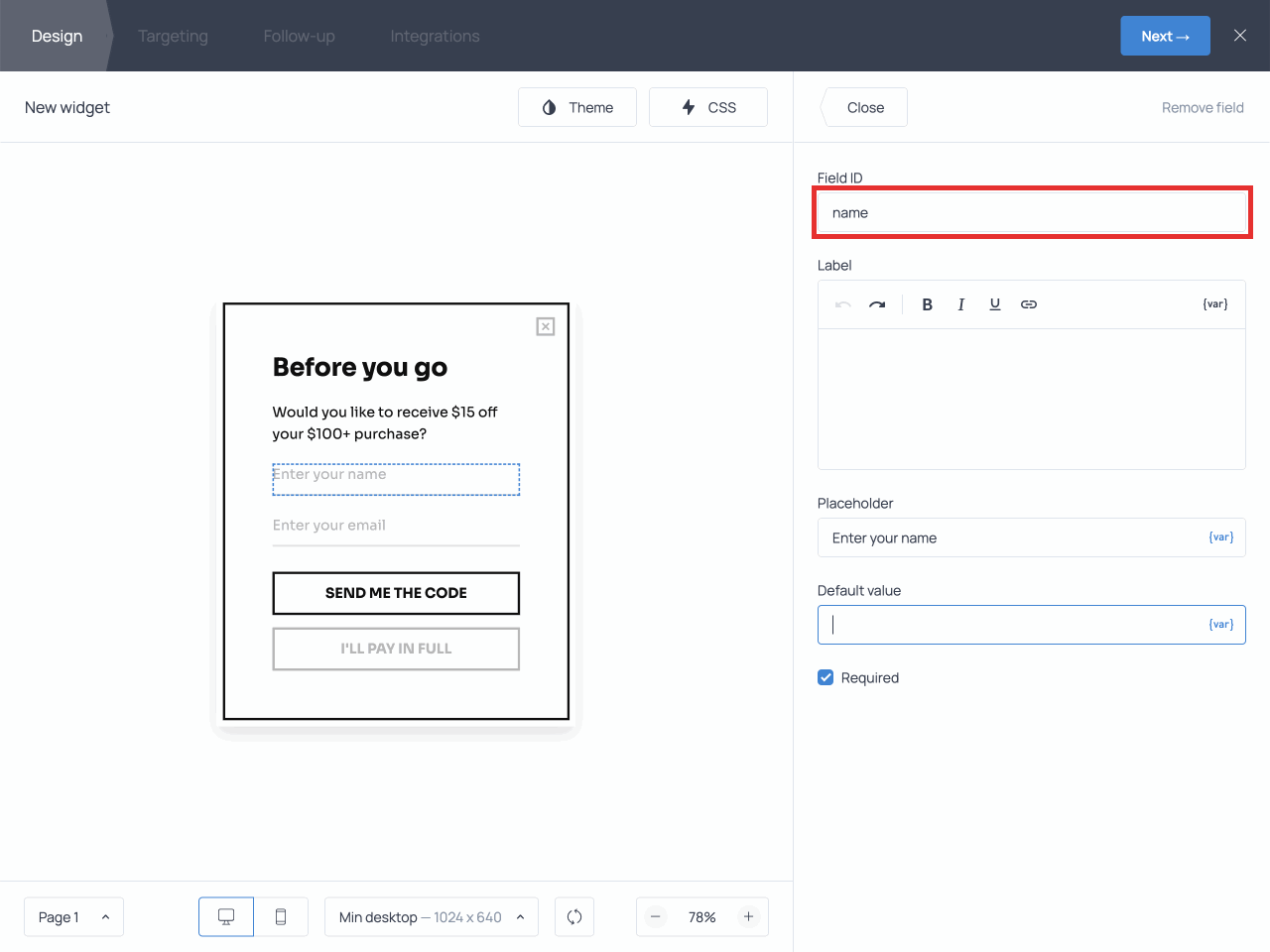Once you add this snippet to your site code, you will be able to use specified variables (“first_name”, “last_name”, “discount”, etc.) in the widget content in your Getsitecontrol dashboard. Put the variables in curly brackets as shown below: