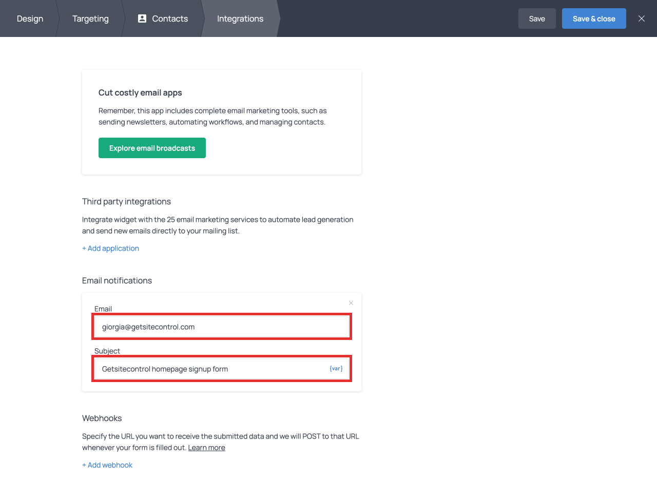 Enter the email address where you want to receive notifications and specify a subject for the emails in the corresponding fields.