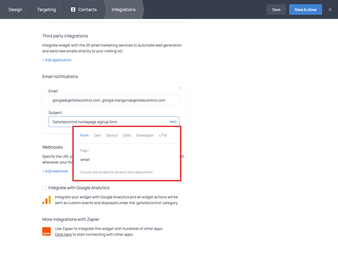 You can use variables in the subject of the email. For example, you can use the email submitted via the form as the subject of the notification. Click {var} to open the menu with all the available variables: