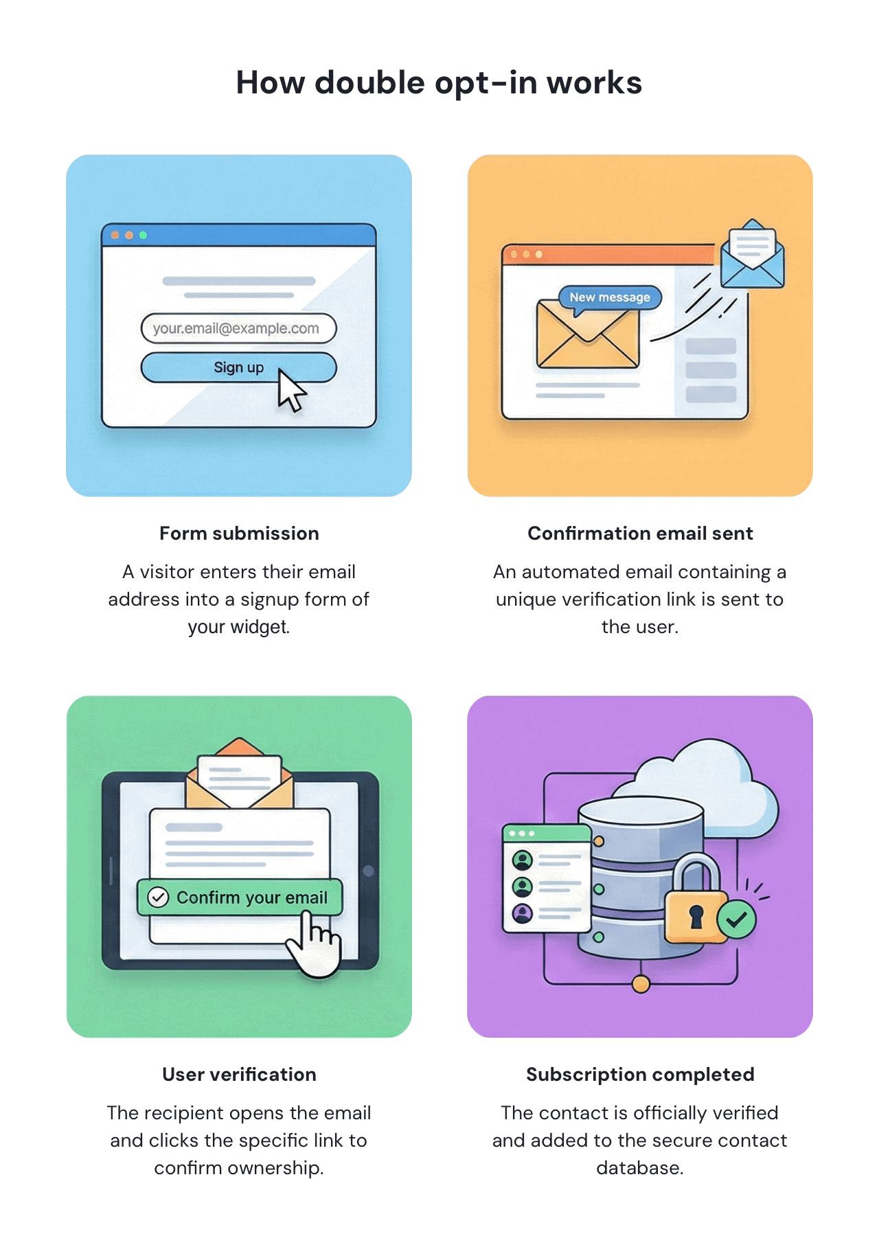 | Verify email ownership | Double opt-in |