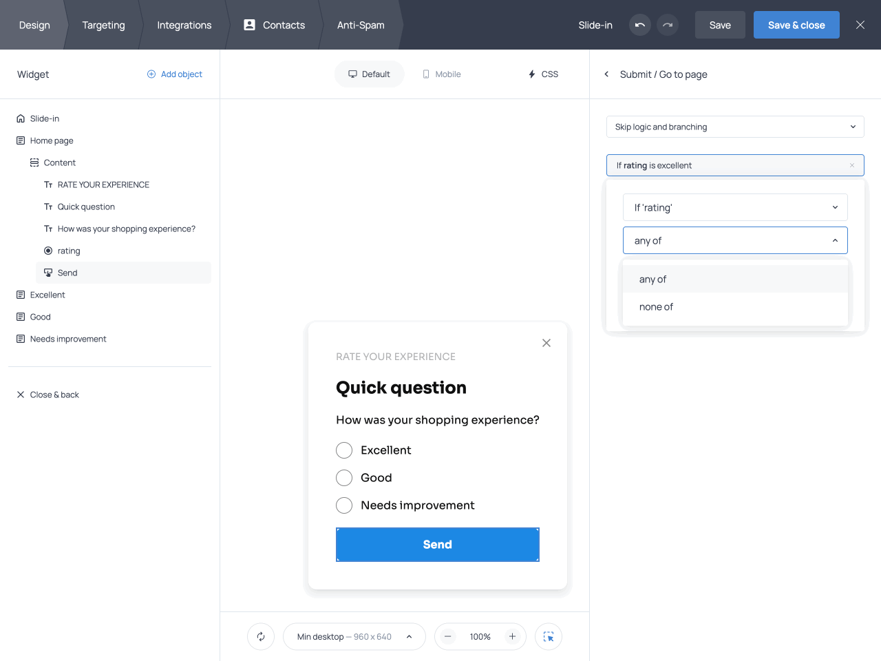 For example, to show a follow-up page only when a respondent selects ‘Excellent’ as a rating, use any of and select ‘Excellent’ as the matching value.