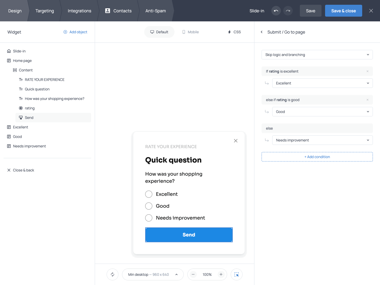 Branching rules define how different answers connect to different outcomes. In Getsitecontrol, branching rules are configured in the button’s Submit/Go to page action. To define custom rules, the action must be set to Skip logic and branching instead of the default Linear page order.