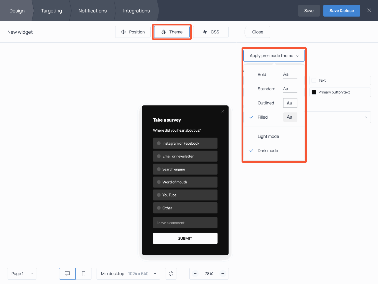 Now, if you’d like to change the color theme, font, or style of the survey, open the Theme menu. You can select one of the pre-made themes from the dropdown list or select the colors manually.