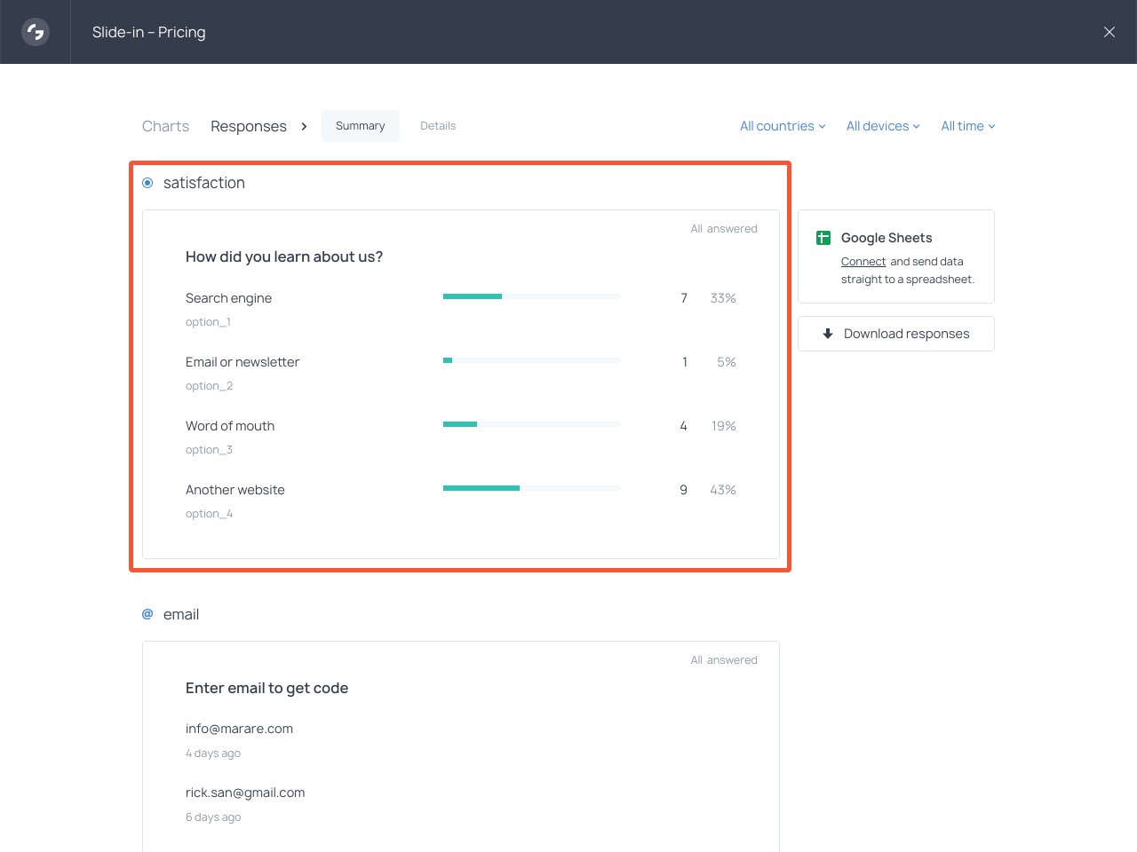 When your survey starts collecting submissions, you’ll see it right in your Getsitecontrol dashboard. To view the responses, open the Statistics report and proceed to Responses. This is what the report will look like 👇