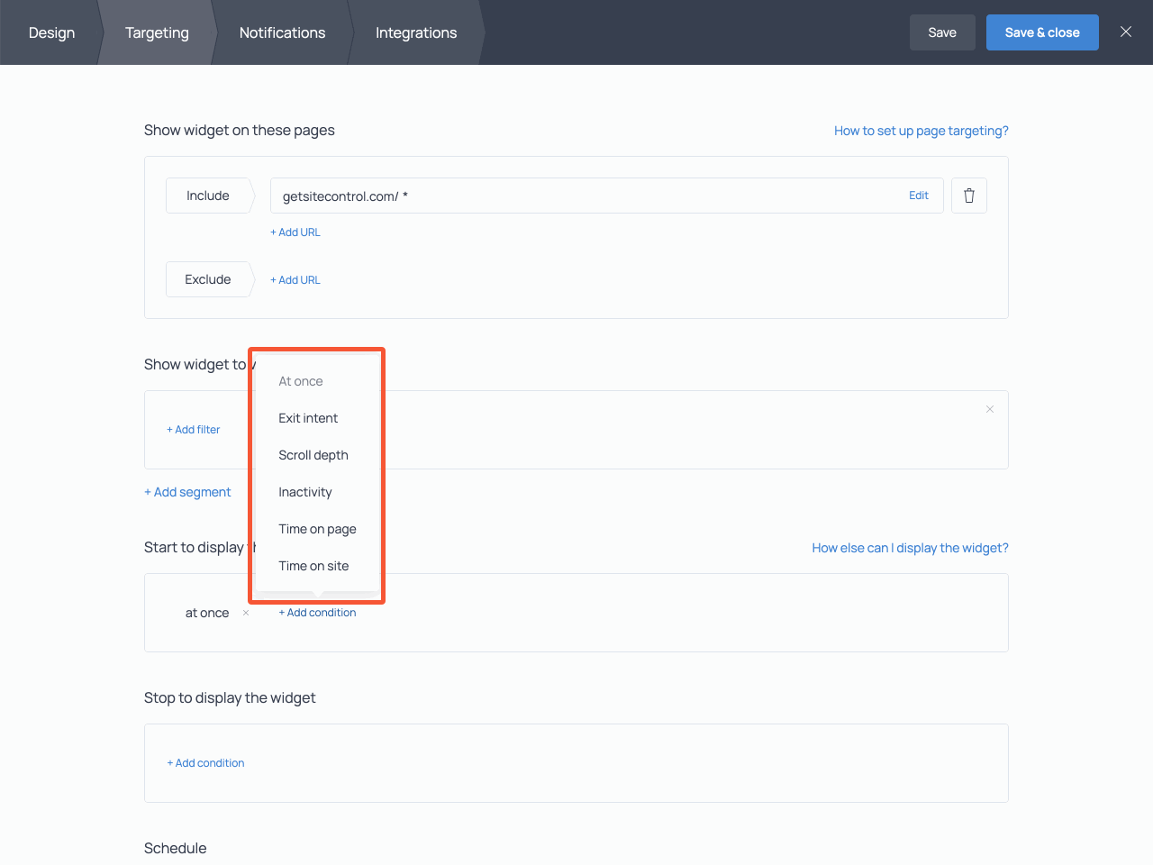 Remove the default settings from these fields and set your own rules. For example, we recommend displaying the survey after a visitor spends some time on a website or scrolls down the page.