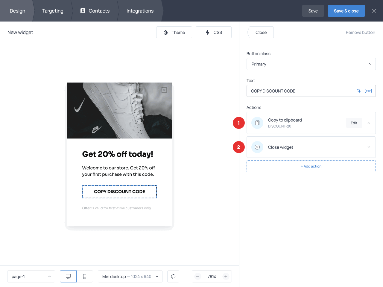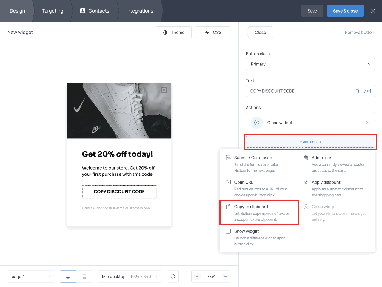 Click OK and double-check your button settings before closing the menu. You should have two actions applied: ‘Copy to clipboard’ and ‘Close widget’. The latter action closes the popup after a customer copies the code and sees the confirmation message.
