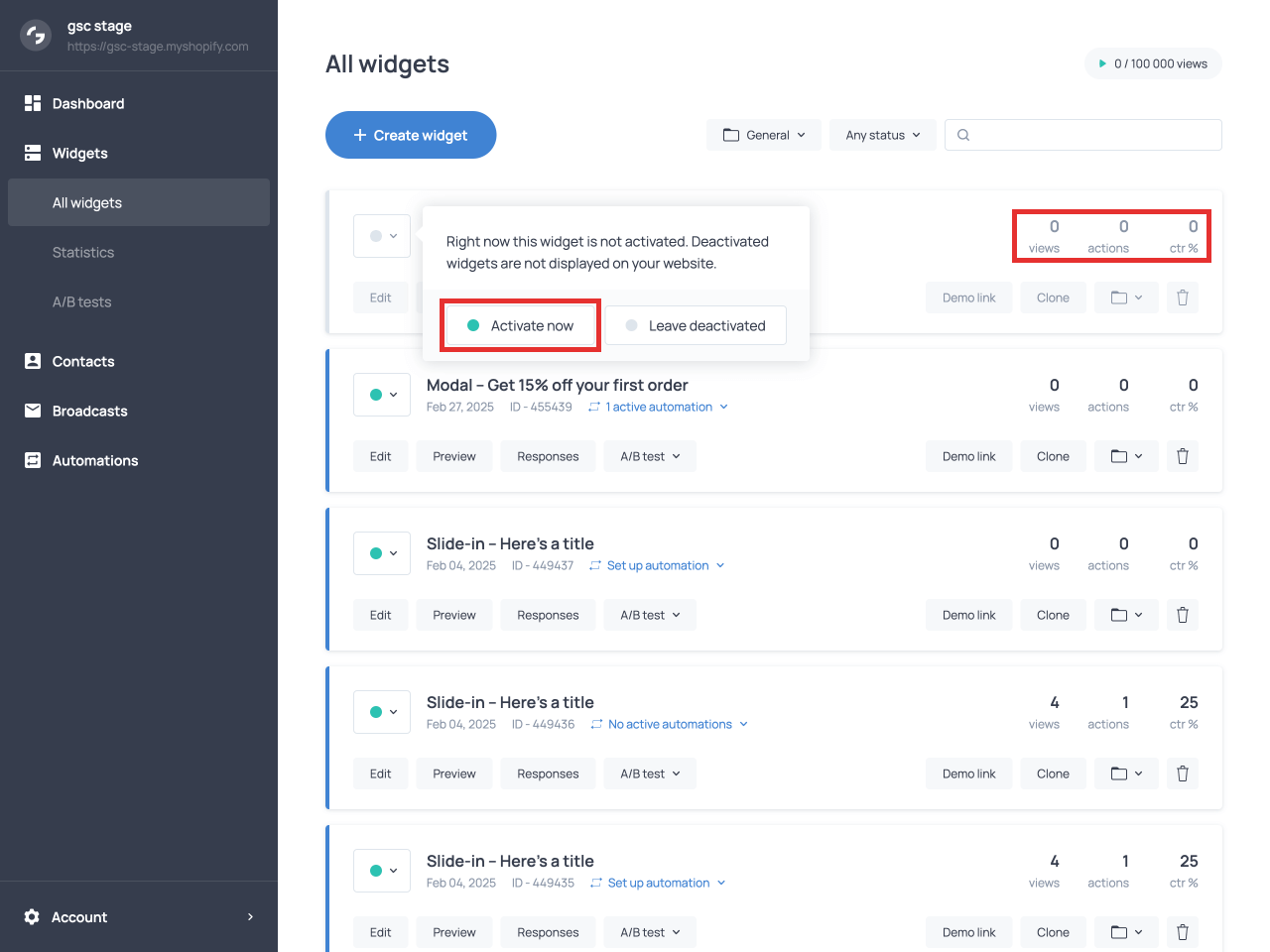 Once setup is complete, save your changes and activate the popup in your store by following the on-screen prompts. As soon as it starts getting views and hits, you’ll see them in the quick performance stats section.