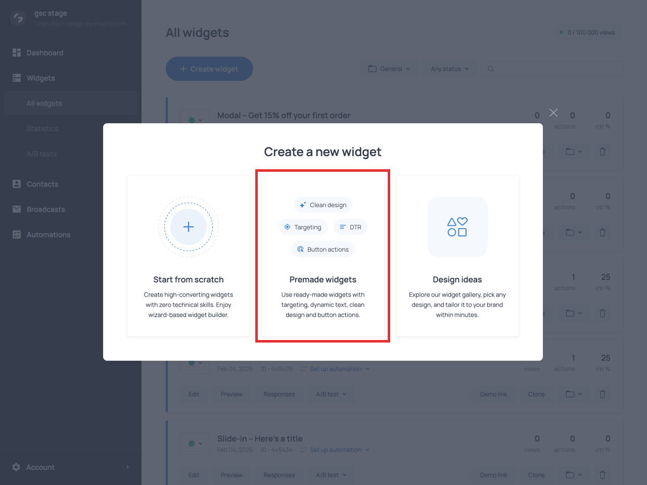 If you’ve already added the app to your website, log into the dashboard, go to Widgets, and click Create widget. Then proceed to Premade widgets.