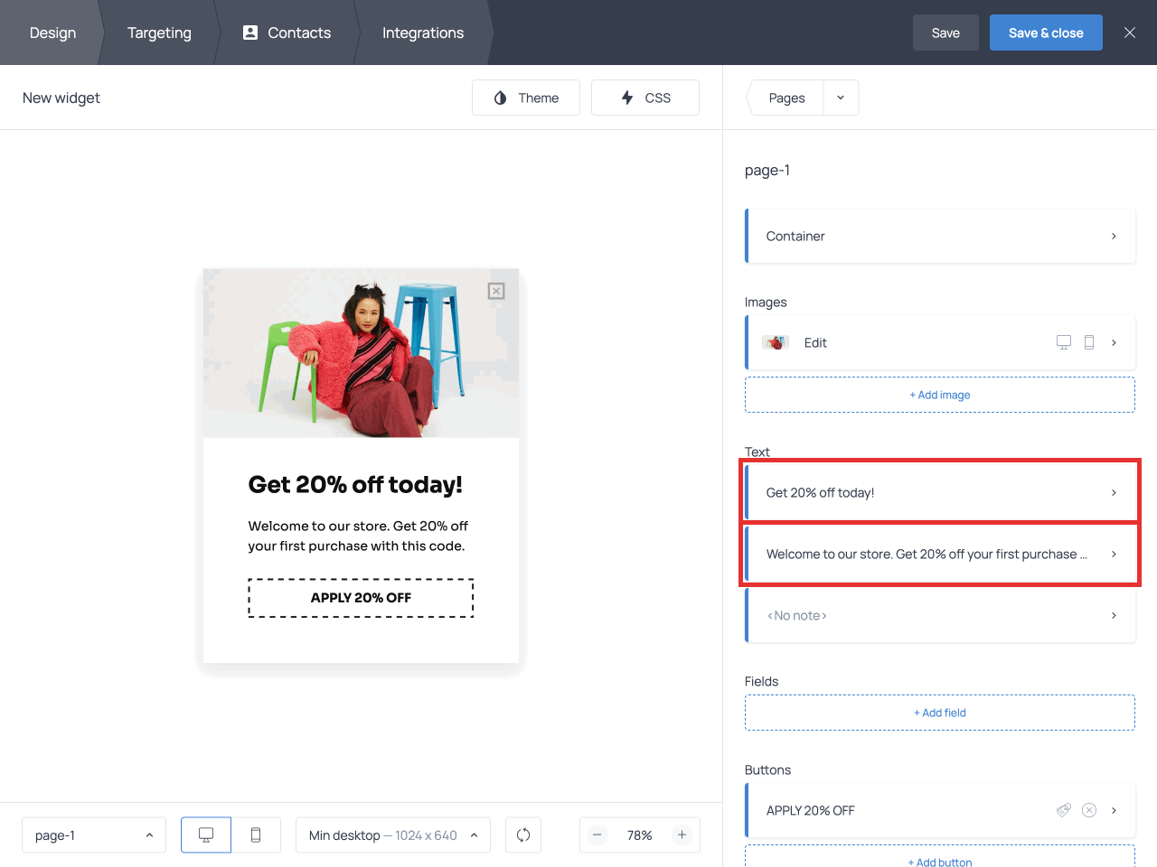 Once you’re done with the coupon design, hit Continue → in the top right corner to move on to the Targeting tab. That’s where you can define where and when the discount offer will pop up.