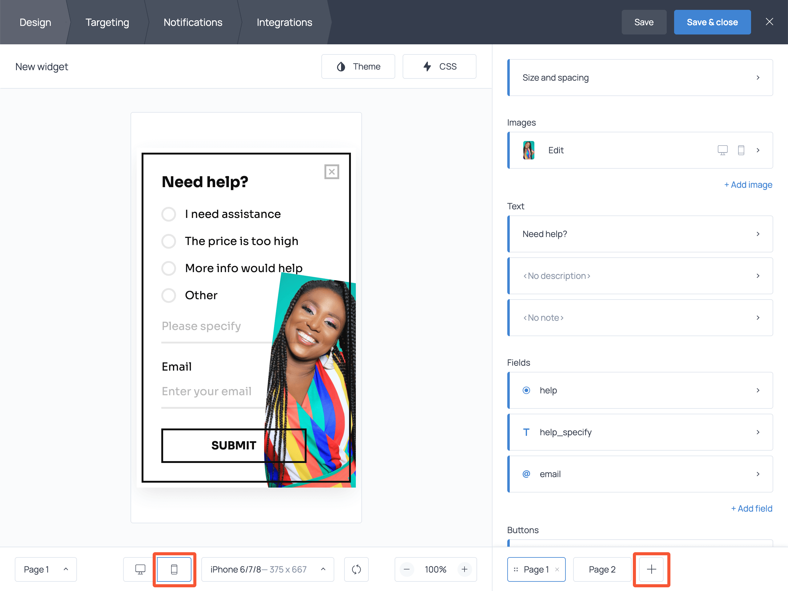 Switch to the mobile preview to see your survey on a smaller screen. Notice: you can change or remove the image on the mobile version of the popup only. Plus, if you feel there’s too much content for a single page, consider adding a new page and moving some of your questions there.