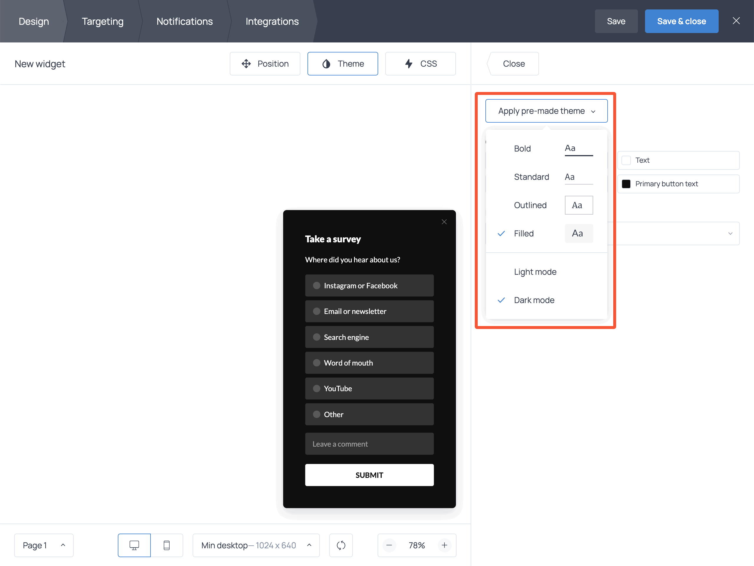 To edit the text, make a click on the corresponding text field and proceed with your adjustments. To customize the appearance of the form, open the Theme menu at the top. Notice that you can either manually change the colors and the font on the survey popup or select one of the pre-made styles.