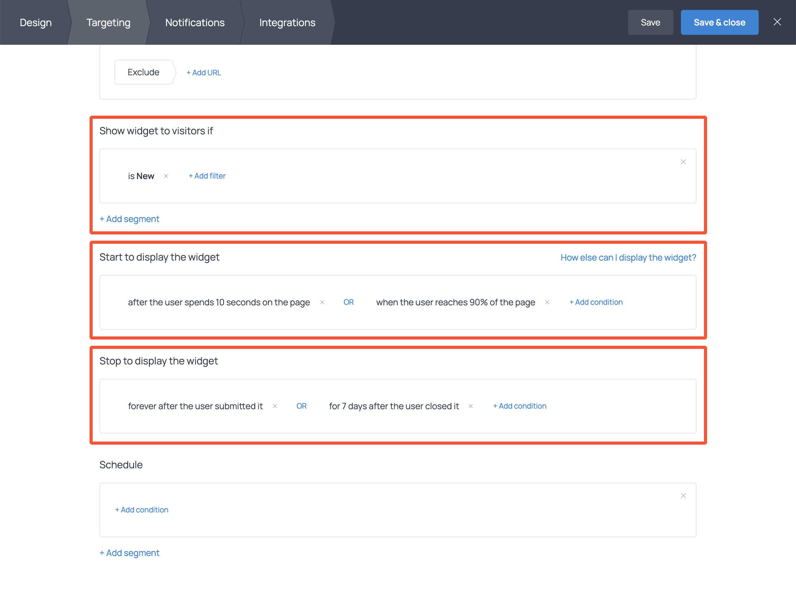 Decide whom you’re going to survey and open the Targeting tab. For instance, in the case of the “How did you hear about us” survey, you may want to display it to first-time visitors who have shown interest in your website content.