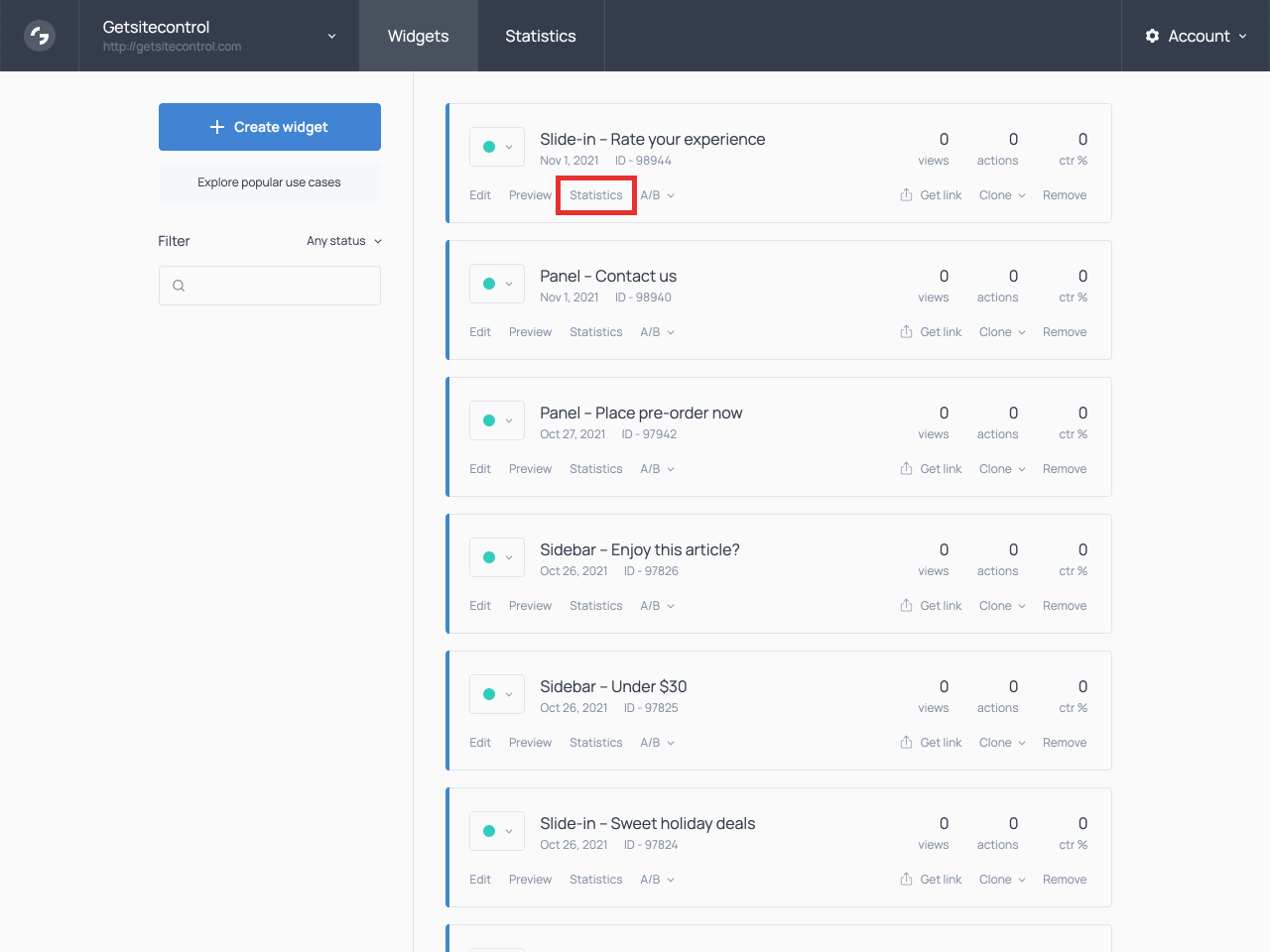 Before getting started, decide what type of survey you want to conduct. To access survey templates, log into the Getsitecontrol dashboard, hit Create widget, and proceed to the template gallery.
