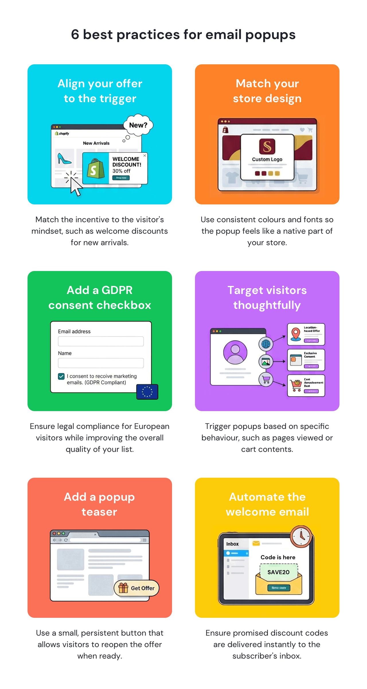 Stores with European visitors are legally required to obtain explicit consent before sending marketing emails. A mandatory GDPR consent checkbox added to the popup form satisfies that requirement at the point of email capture. Beyond compliance, it also improves list quality. Subscribers who consciously check a consent box tend to be more engaged than those who signed up without fully understanding what they were agreeing to.