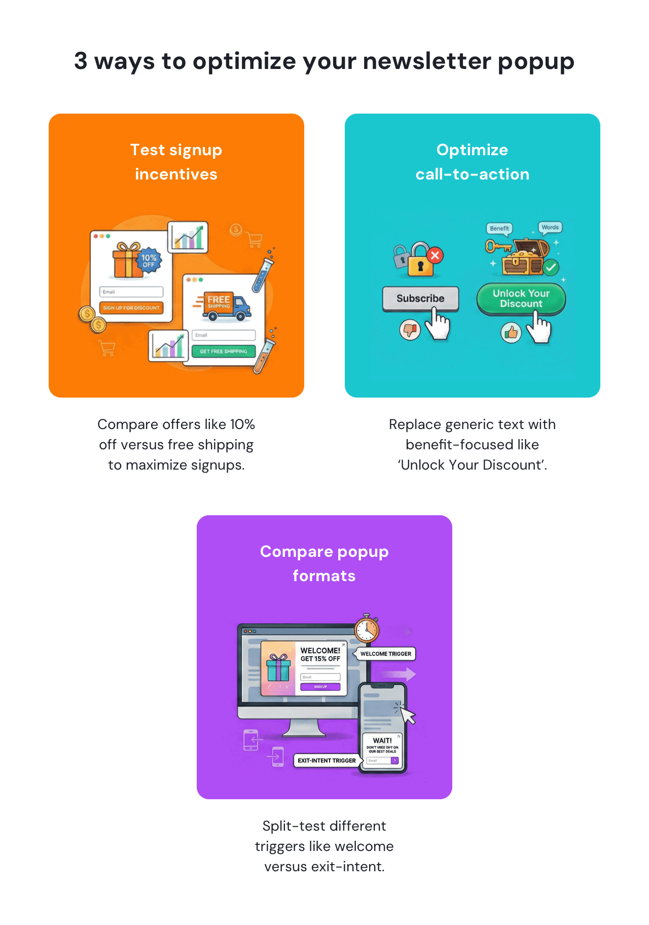 Test popup timing, type, and design approach. For example, split-test a welcome popup with an exit-intent popup, or run a two-step popup alongside a traditional single-step popup to see if conversions vary significantly.