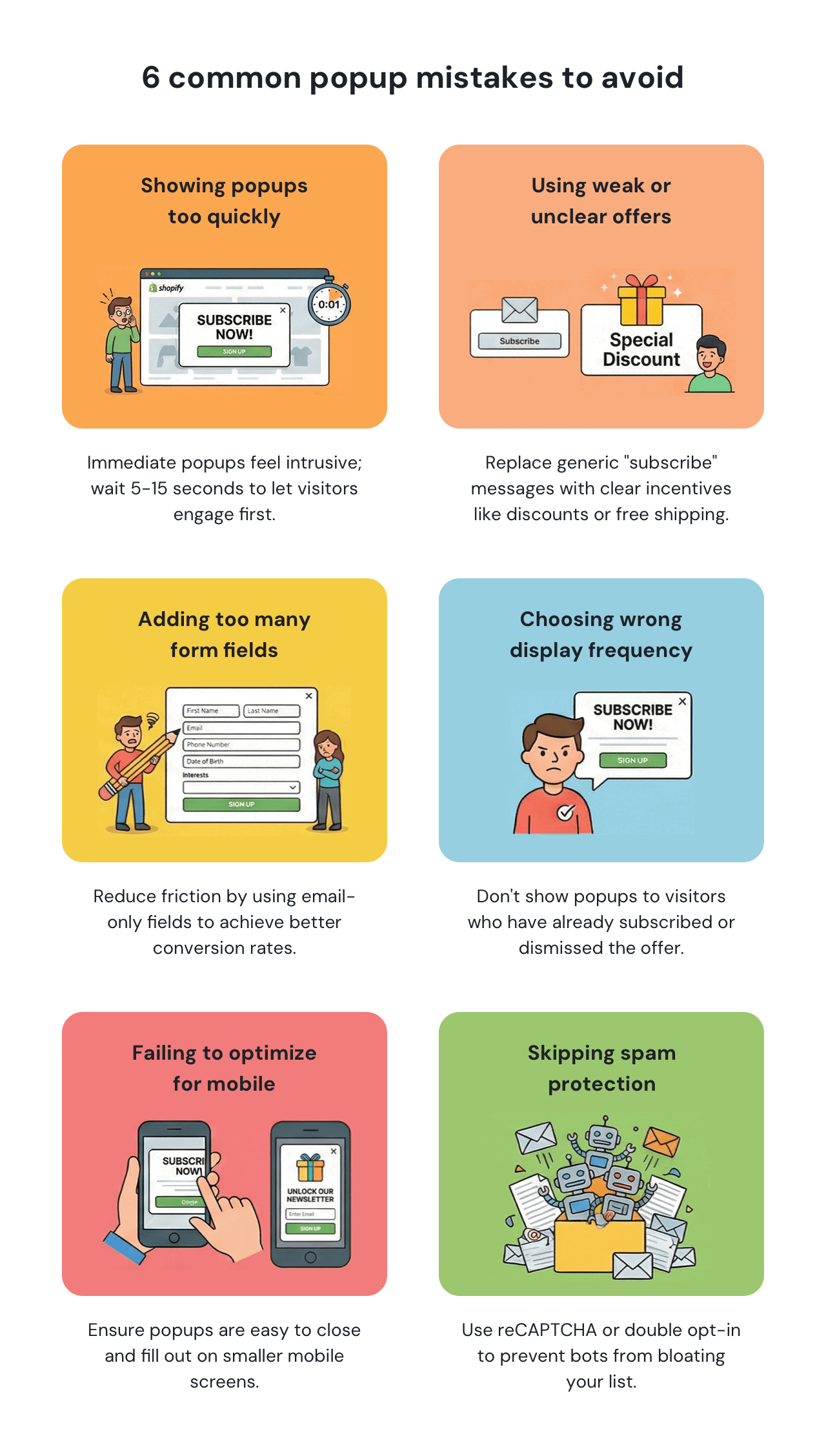 Every additional field creates friction. Email-only popups usually convert better than forms that ask for names, phone numbers, or birthdays. Add extra fields only when you plan to use that information for segmentation or personalization later.