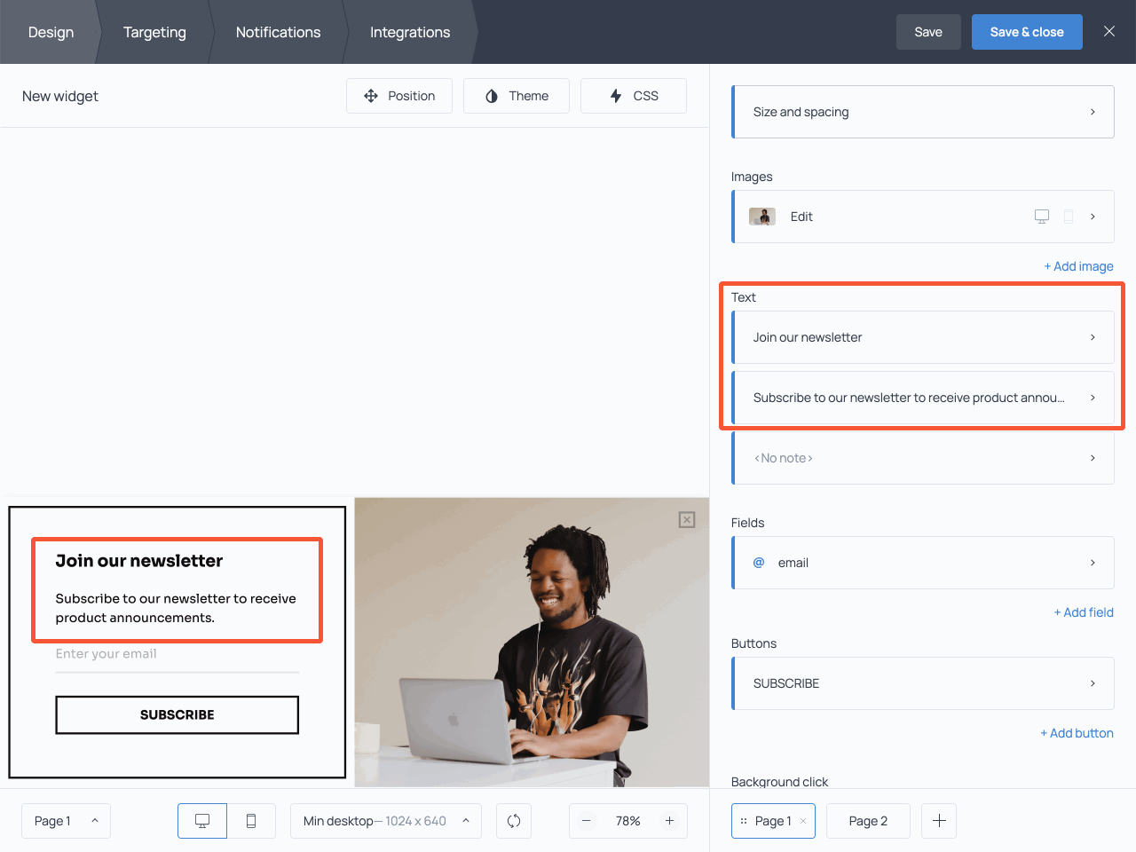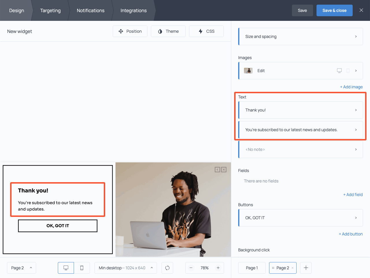 Once in the dashboard, click on the copy or image to change them to your taste. Next, open Page 2 and customize the default submission success message – an immediate message displayed to new subscribers.