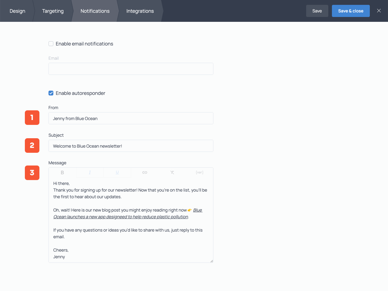 From there, hit Save & close in the top right corner and activate the popup on your website. Don’t forget to test it and see how the auto response will look in your inbox.