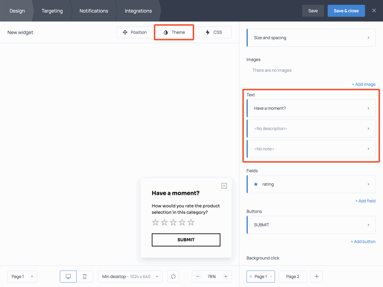 On the first screen, you can customize your survey. To change the color theme, style, and font, use the Theme button at the top. To change any piece of text, just click on it and type the new copy.